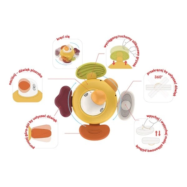 Ce mignon petit caneton propose jusqu’à 8 fonctions sensorielles qui divertissent et stimulent le développement de votre bébé dès le plus jeune âge. Tourner, presser, secouer et siffler offrent une variété de stimuli qui éveillent les sens et motivent l’enfant à bouger et explorer.