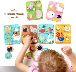 - 6× puzzles de 4 pièces avec des animaux de la ferme (chatons, porcelets, poules, etc.).