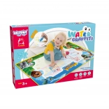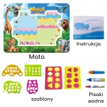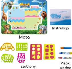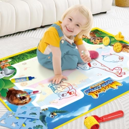Le coffret contient tout le nécessaire : tapis pour dessin à l’eau, 3 feutres à eau réutilisables, 4 pochoirs, 2 tampons et un petit livret illustré avec des instructions. Idéal comme cadeau pour les petits artistes et les préscolaires.