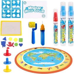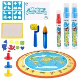 Découvrez le tapis magique à l’eau WOOPIE – une carte du monde ronde sur laquelle les enfants dessinent uniquement avec des feutres à eau. Les couleurs apparaissent au contact de l’eau puis disparaissent en séchant, pour un jeu sans salissures et réutilisable. Le set comprend un riche assortiment de pochoirs, tampons, rouleau et accessoires pour des créations ludiques et l’apprentissage des animaux et des continents.
