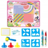 - 1× grand tapis à eau, 6× feutre à eau, 1× rouleau, 3× tampon avec manche, 1× tapis pour empreintes, 4× pochoir, 1× livret de dessin