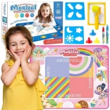 Découvrez une création maligne sans la moindre goutte de peinture. Le tapis utilise des feutres à eau qui laissent sur la surface spéciale des traces colorées qui sèchent et disparaissent en peu de temps. Grâce à ses dimensions de 100 × 80 cm, il y a suffisamment de place pour deux petits artistes. Sa construction légère et pliable assure un transport et un rangement faciles.