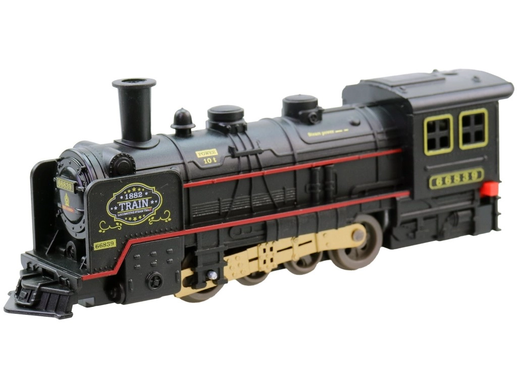 Une locomotive noire avec des éléments rouges et dorés, une cheminée et des roues marquantes apporte l’ambiance d’un véritable chemin de fer à chaque trajet.