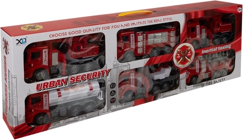 - 6 camions de pompiers (échelle, nacelle, grue, plate-forme, citerne, canon à eau), boîte colorée avec poignée, insert pour véhicules, notice, boîte d’expédition brune