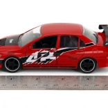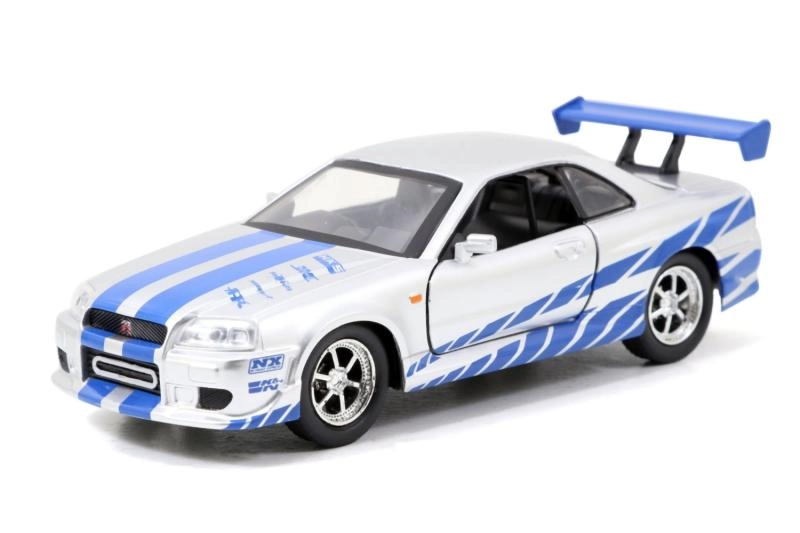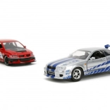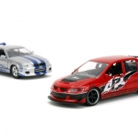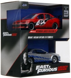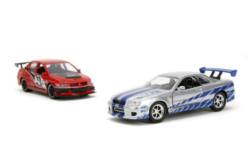 Ce pack duo premium réunit deux voitures de cinéma emblématiques avec une superbe finition : une Lancer Evo IX rouge aux graphismes de course et grand aileron, et une Skyline GT‑R R34 argentée aux bandes bleues. Carrosserie métal, détails réalistes et portes fonctionnelles intensifient l’expérience de collection comme de jeu.