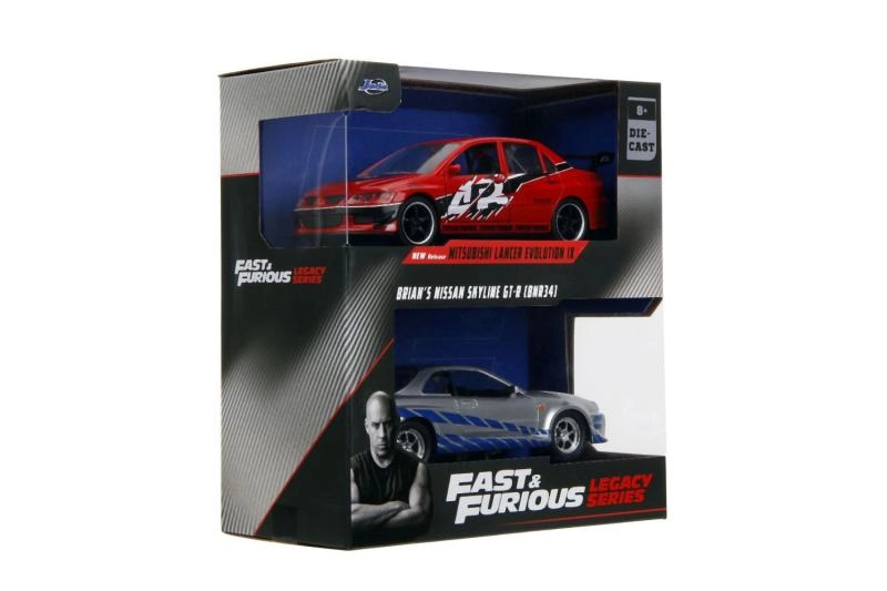 Obtenez d’un coup le Mitsubishi Lancer Evo IX 2006 et la Nissan Skyline GT‑R R34 de Brian – un duo iconique de Fast & Furious à l’échelle 1:32.