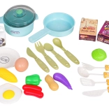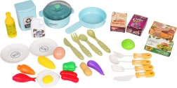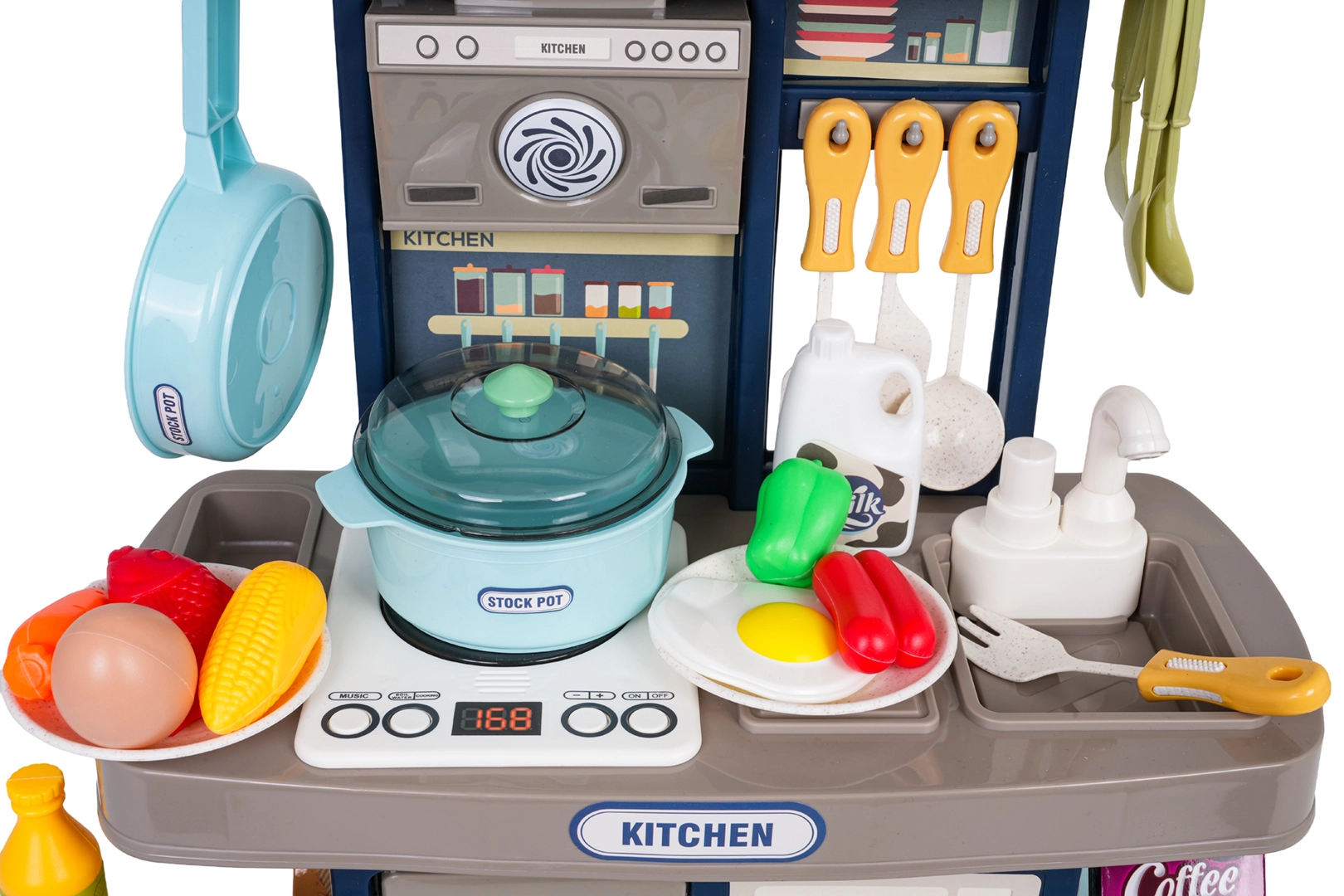 La casserole, la poêle, les ustensiles, les assiettes et les aliments factices complètent le four et le « ice box ». Des crochets et des étagères aident à garder l’ordre pendant le jeu.