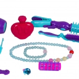 Comprend un sèche-cheveux, un fer à boucler avec lisseur, une brosse pliante, un peigne, des lunettes, des flacons, un « rouge à lèvres » et un « vernis », un collier de perles, un bracelet, une bague, des barrettes, un élastique et d’autres petits accessoires.