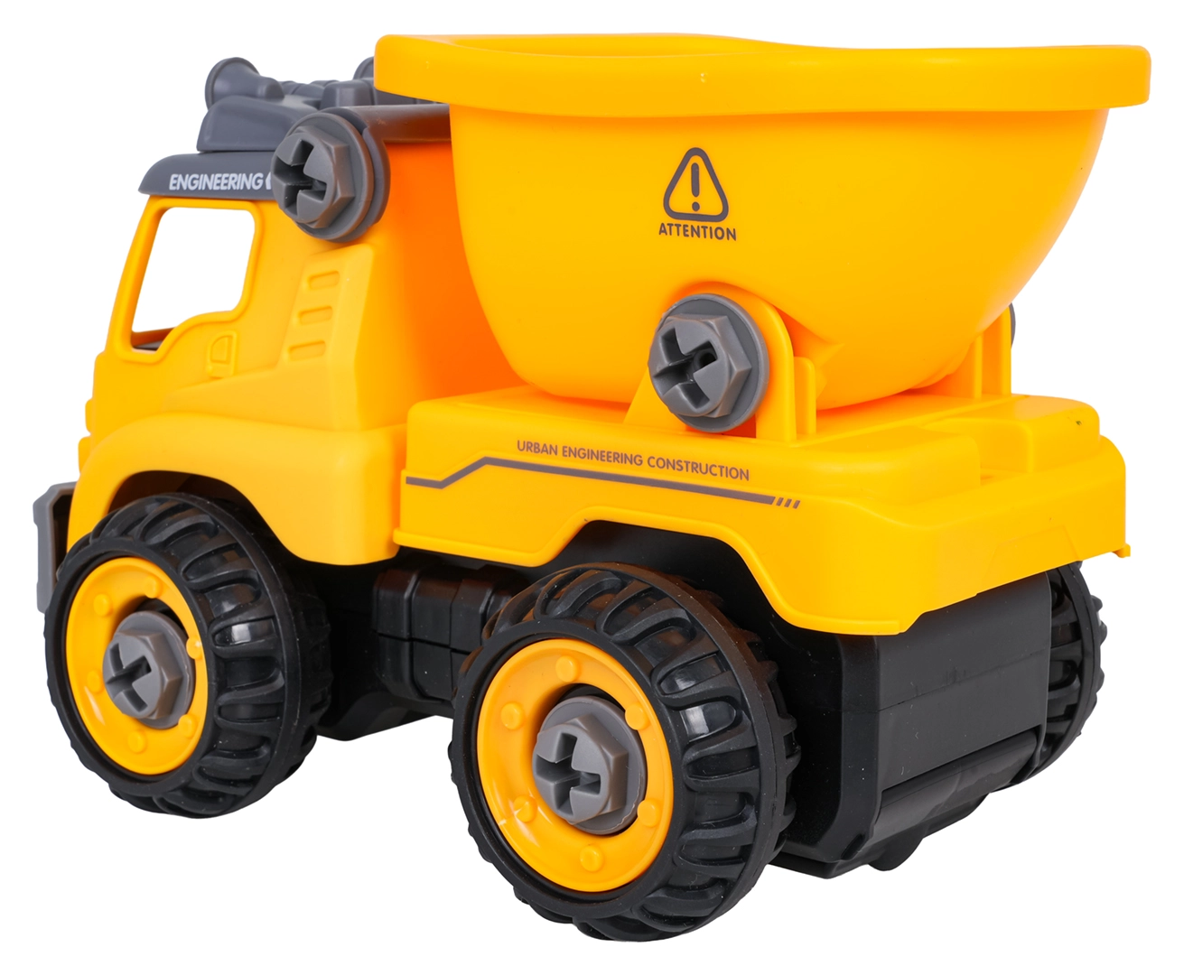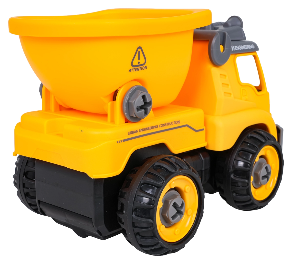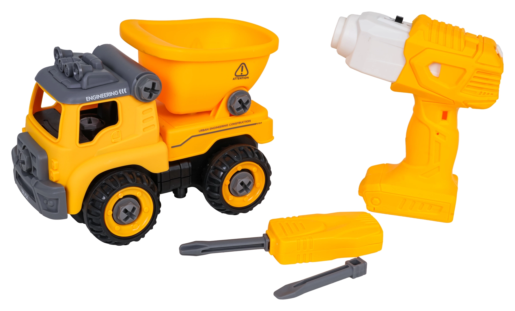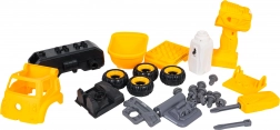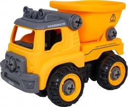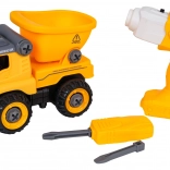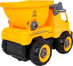 La benne de chantier est livrée entièrement assemblée et prête à rouler. À l’aide de la perceuse à piles et du tournevis manuel fournis, les enfants peuvent la démonter en pièces puis la remonter. Le véhicule est fabriqué en plastique résistant aux couleurs vives, idéal pour un jeu quotidien.
