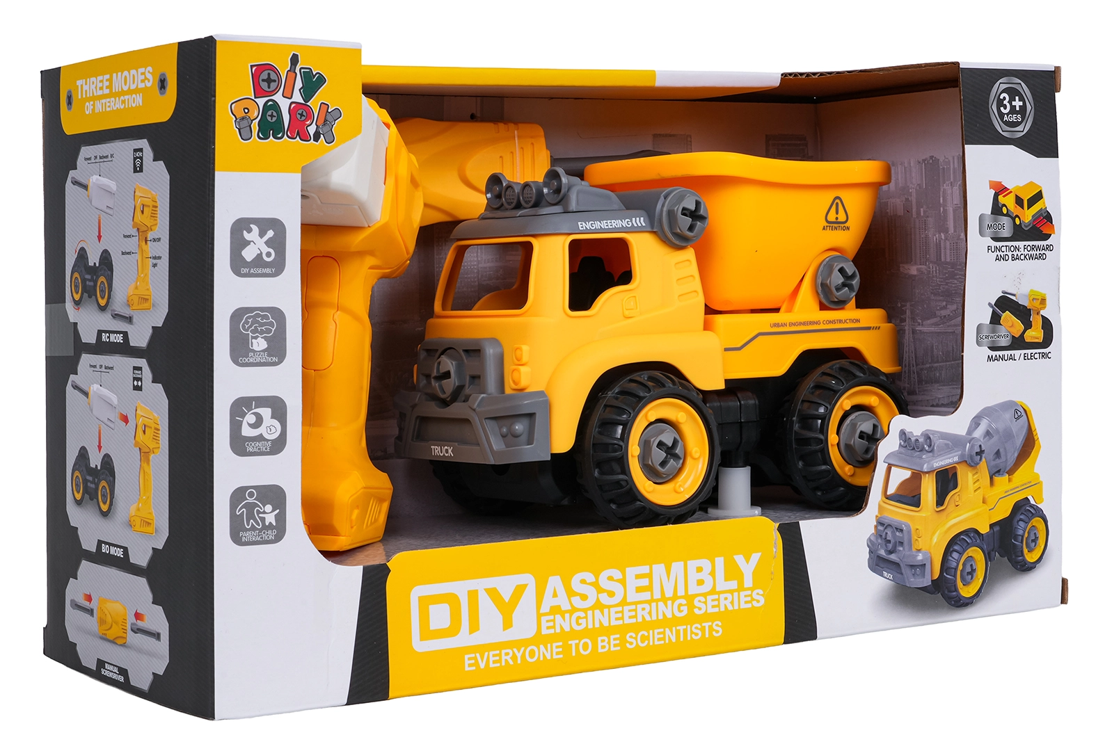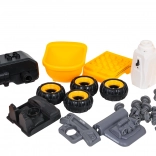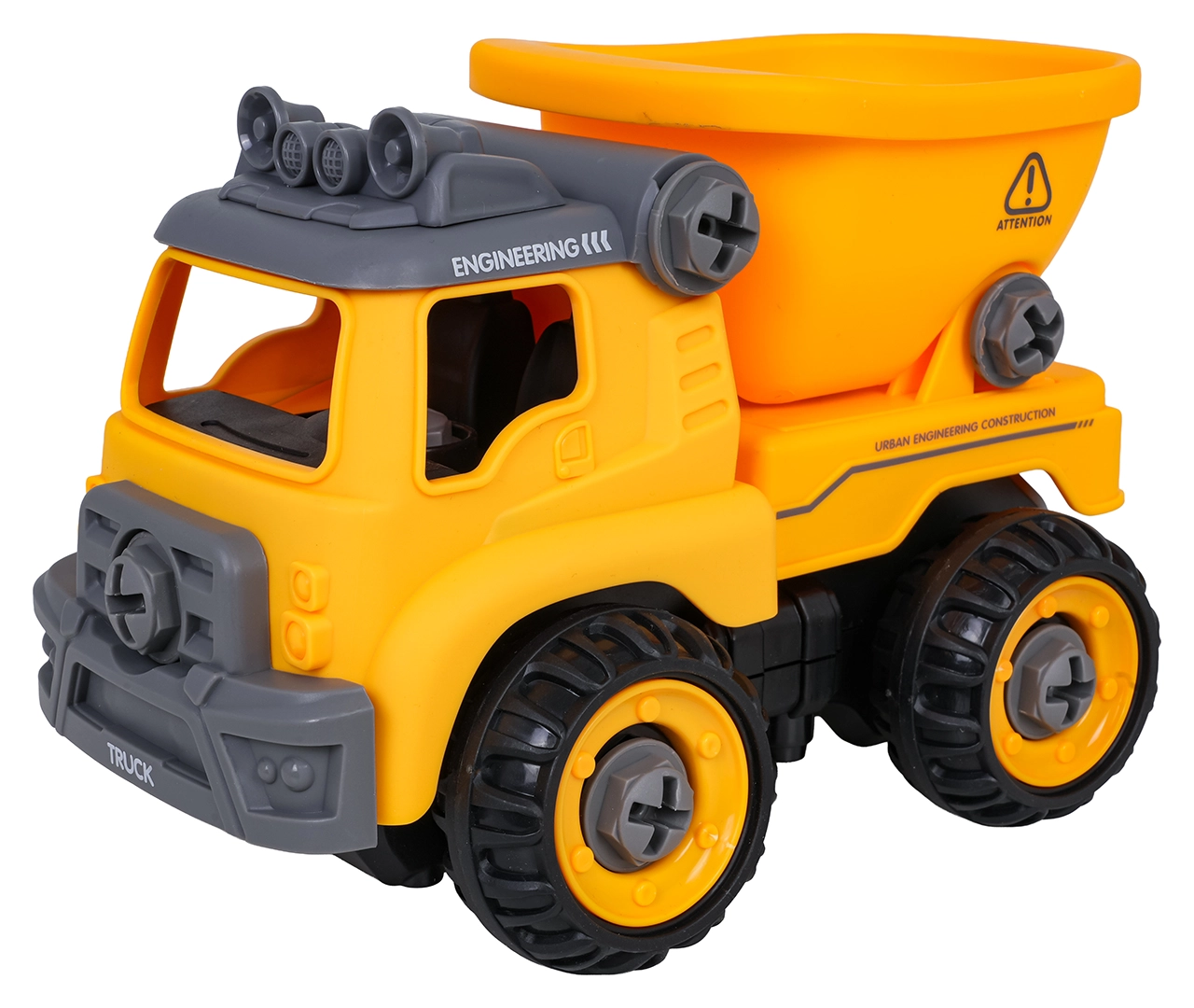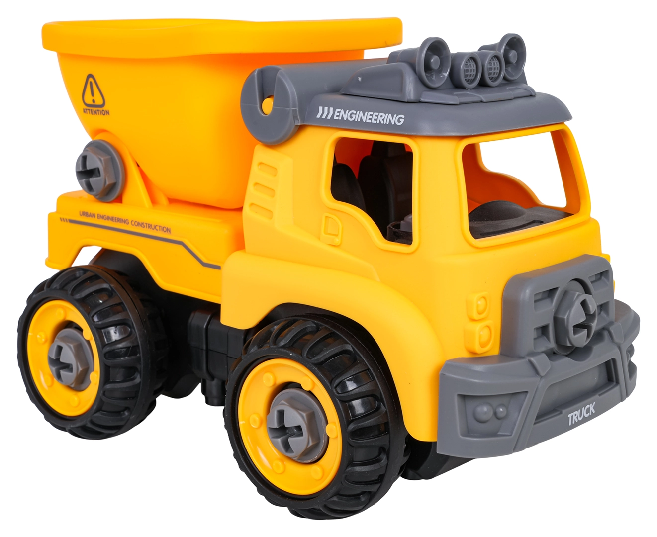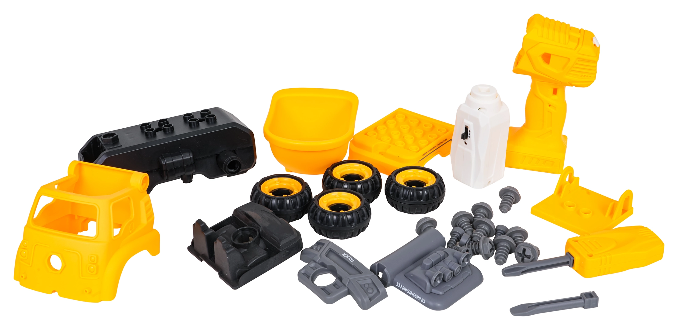 La benne de chantier est livrée entièrement assemblée et prête à rouler. À l’aide de la perceuse à piles et du tournevis manuel fournis, les enfants peuvent la démonter en pièces puis la remonter. Le véhicule est fabriqué en plastique résistant aux couleurs vives, idéal pour un jeu quotidien.