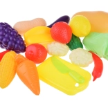 - Ensemble d’accessoires riche – différents fruits et légumes, planche à découper et petit couteau pour imiter la préparation des repas.