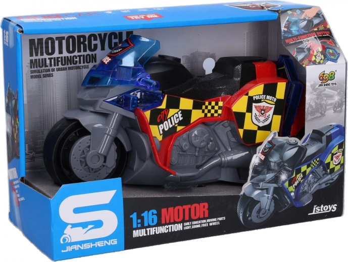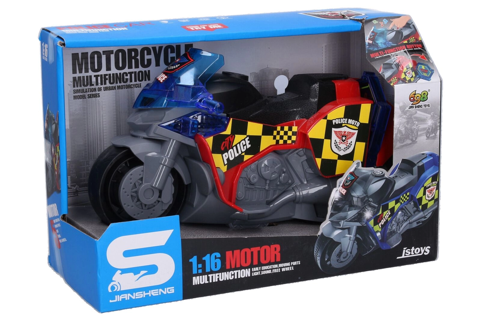 Des accessoires pratiques, comme un espace de rangement sur le côté droit et un panneau STOP rabattable sur le côté gauche, encouragent un jeu créatif et réaliste. Les piles 3× AG13 sont fournies, la moto est donc prête à l’emploi dès le déballage.