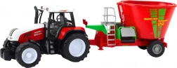 Le tracteur rouge avec remorque et grand mélangeur d’aliments reproduit fidèlement une machine agricole réelle. Grâce au mouvement après impulsion, le véhicule avance tout seul et la remorque avec mélangeur ajoute encore plus de réalisme au jeu – les enfants peuvent simuler l’alimentation des animaux et la vie quotidienne à la ferme.