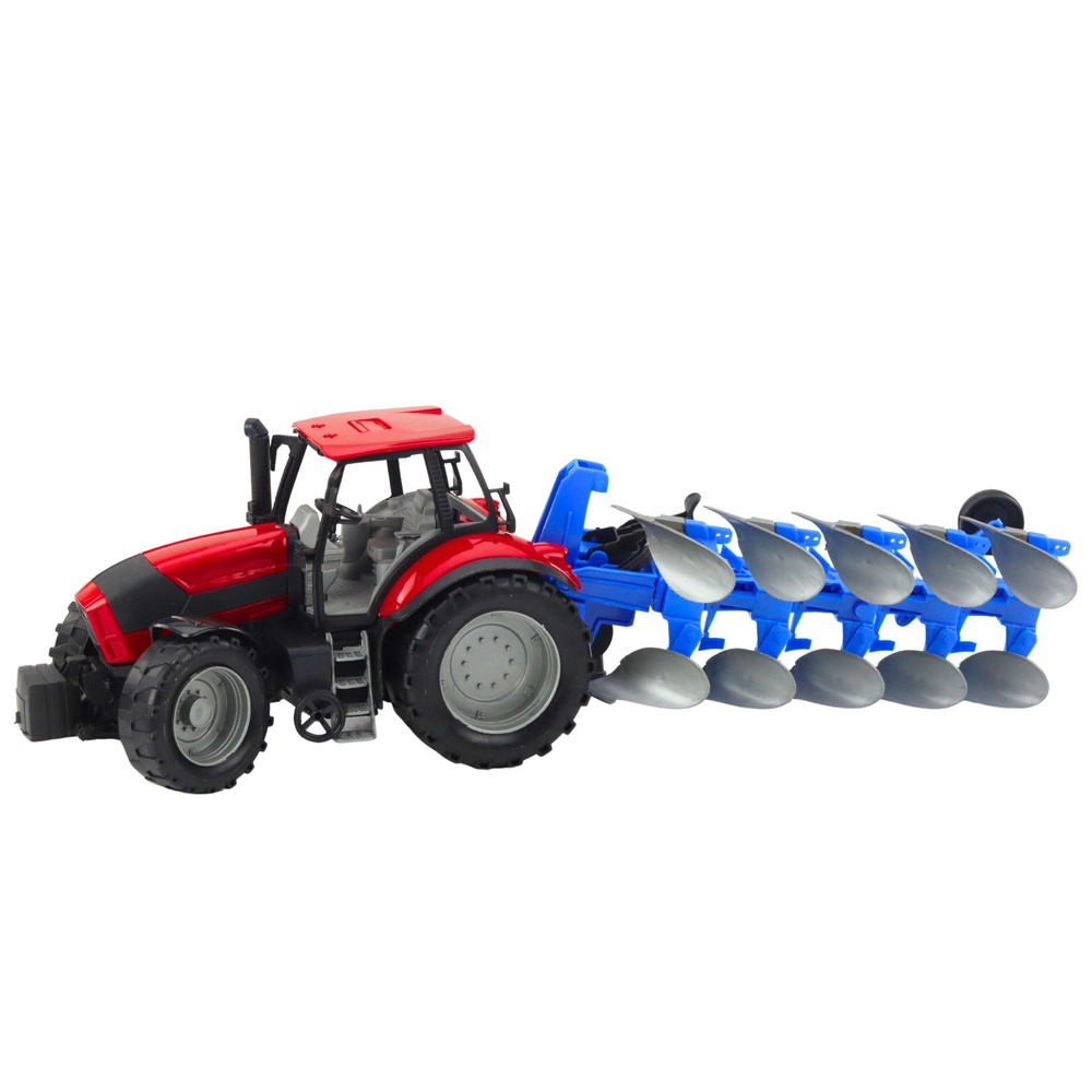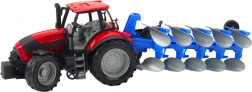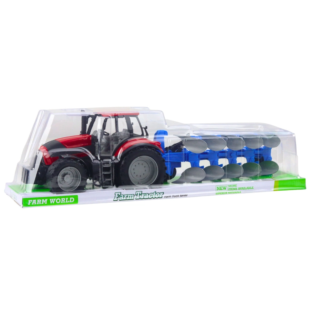 Tracteur réaliste avec charrue pour petits fermiers offrant de grandes dimensions de 50 cm, une traction arrière et un design détaillé. Ce robuste tracteur rouge avec une charrue bleue à plusieurs socs favorise le jeu créatif et développe la connaissance du travail à la ferme. Parfait comme jouet et set éducatif, livré dans un emballage cadeau avec face avant transparente.