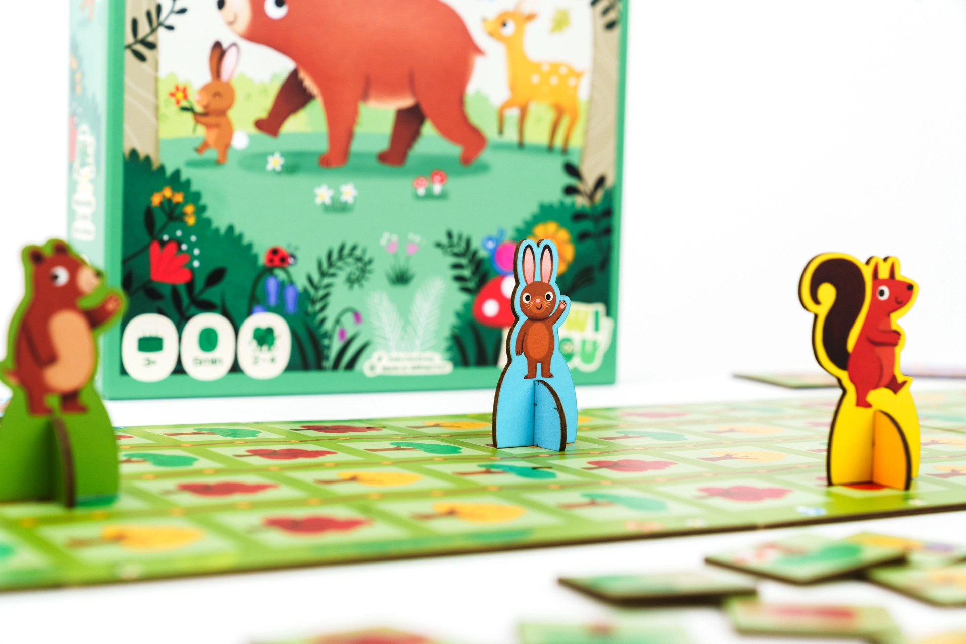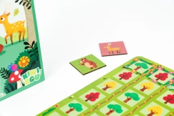 Courses en forêt est un jeu de société pour enfants rythmé, où d’adorables animaux essaient d’être les premiers à traverser la forêt jusqu’à l’arrivée. Au lieu de lancer un dé classique, les joueurs tirent simultanément des jetons d’un sac – ce tirage détermine sur quelle case tout le monde avance. Parfois, un jeton nourriture apparaît et les coureurs ne résistent pas au goûter, ce qui ralentit agréablement la course et ajoute un effet de surprise.