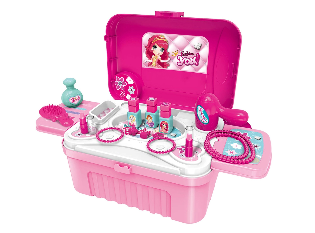 Ce set de maquillage rose est idéal pour les petites coquettes qui aiment les jeux imaginatifs. La valise pratique, avec roulettes et poignée télescopique, se transforme facilement en coiffeuse stable avec miroir intégré. Elle offre également suffisamment d’espace de rangement pour tous les accessoires.