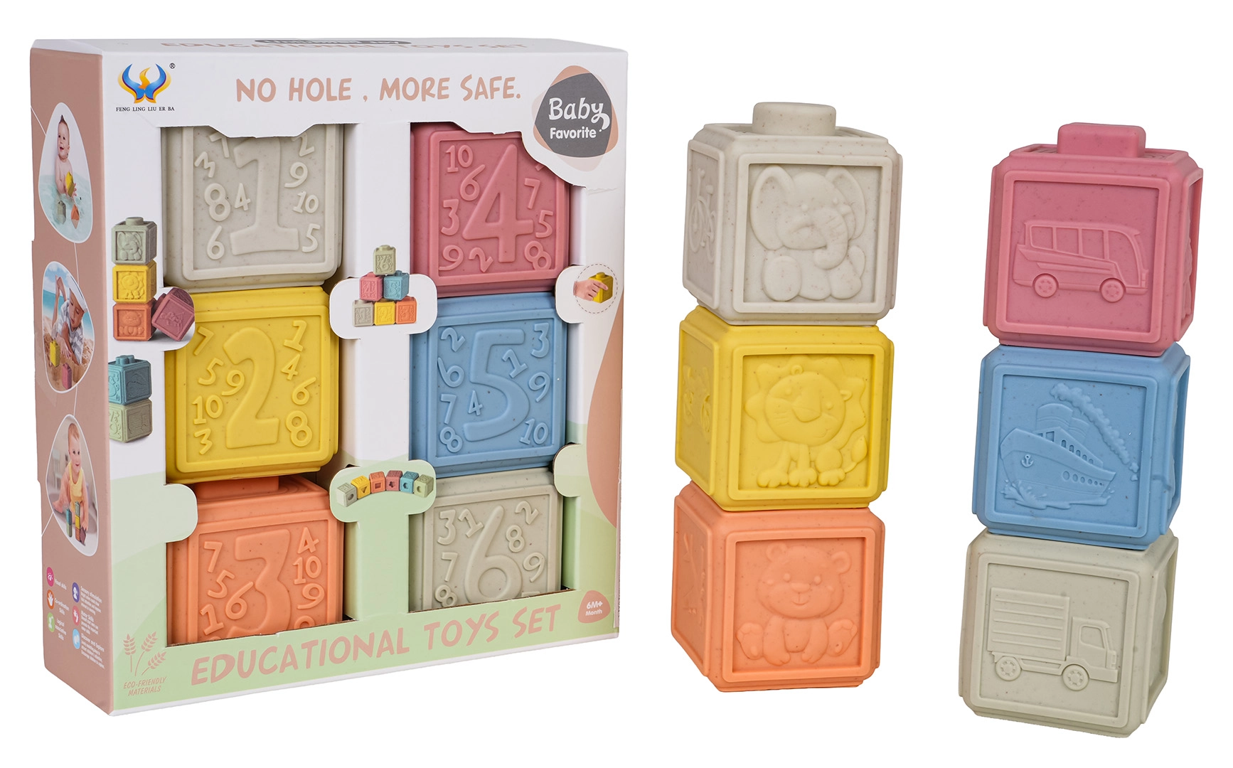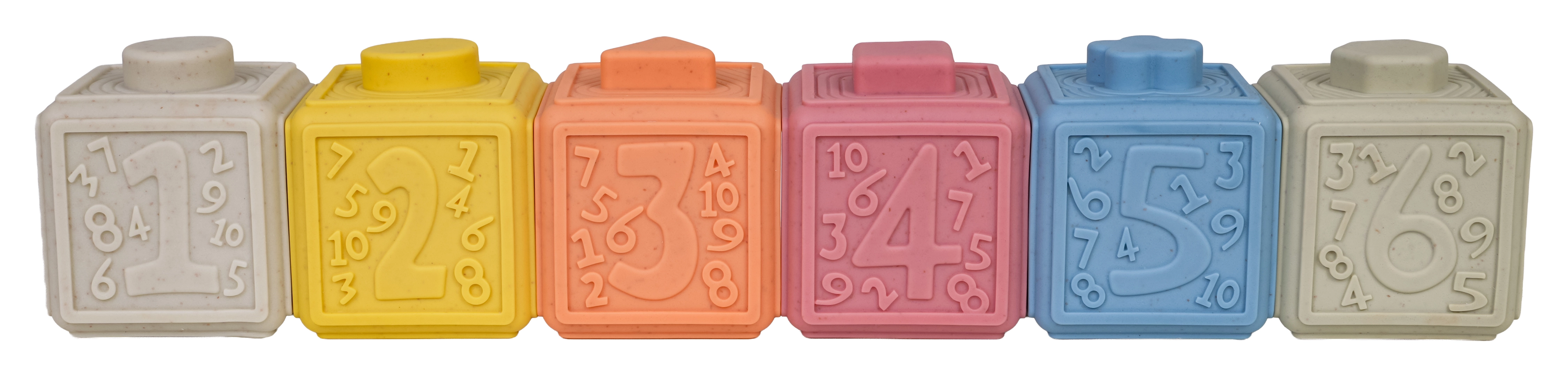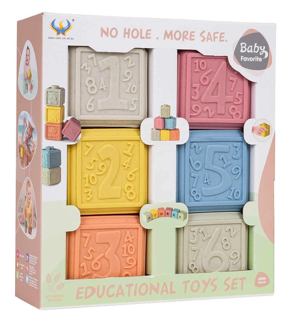 Un set écologique de 6 cubes souples aux couleurs pastel offrant d’innombrables possibilités de jeu et d’apprentissage. Chaque cube possède une texture de surface et des motifs différents, favorisant la motricité fine, la coordination œil–main et le développement des sens. Grâce à leur matériau sûr et souple, ils sont idéals pour les tout-petits et peuvent également servir de jouets de dentition pendant la poussée dentaire.
