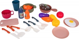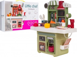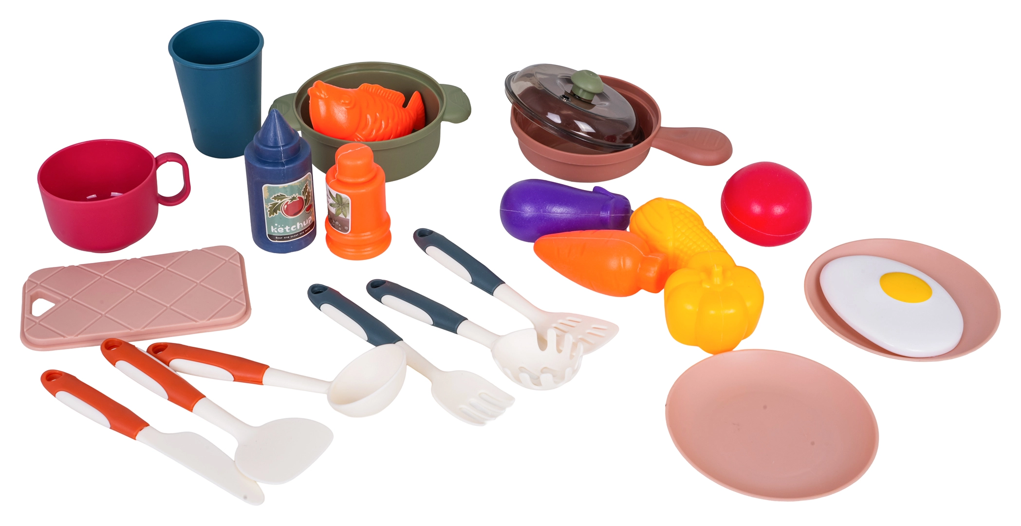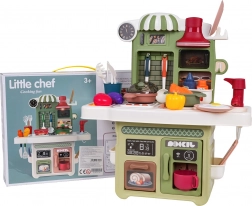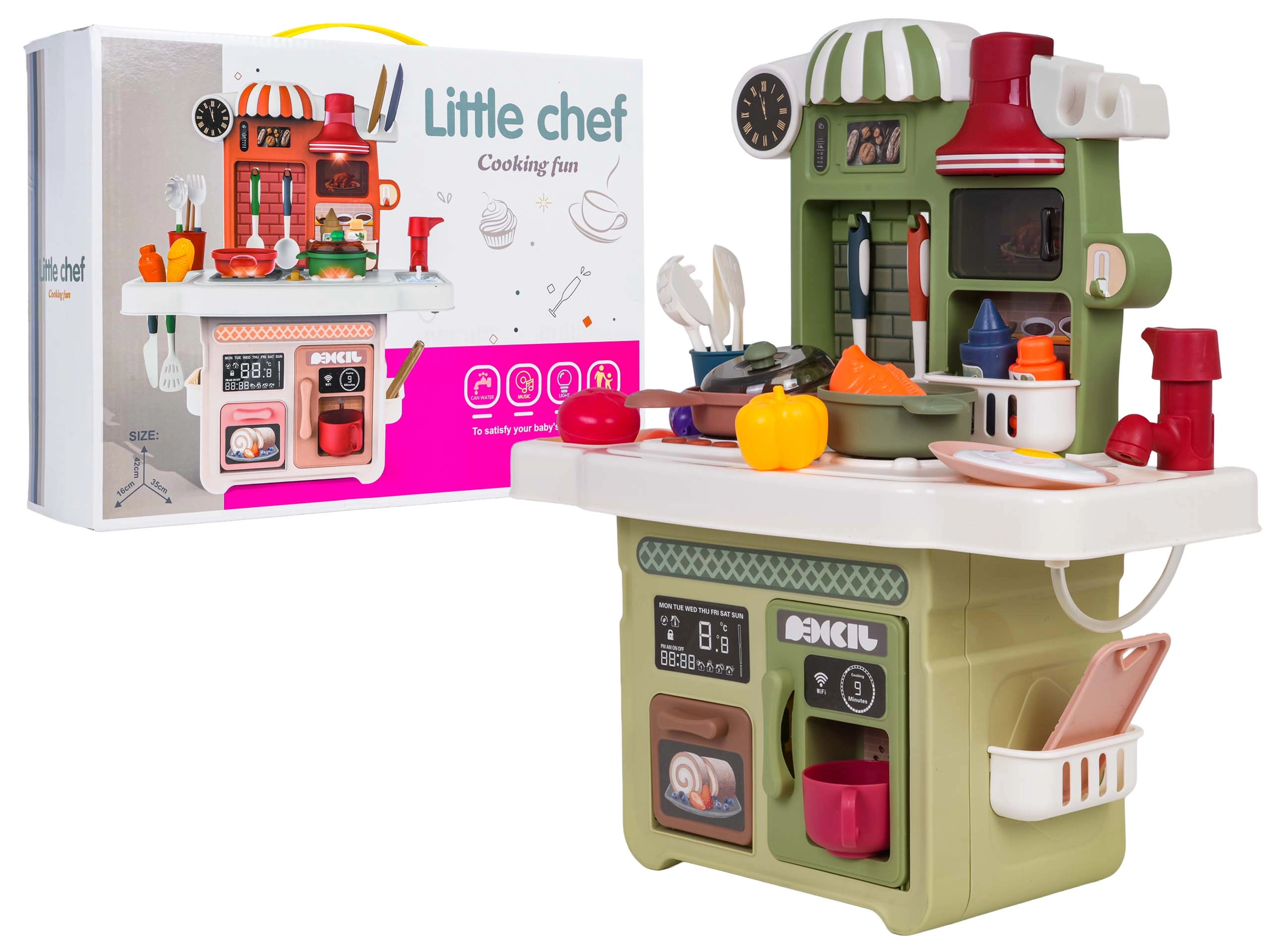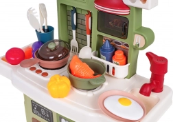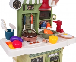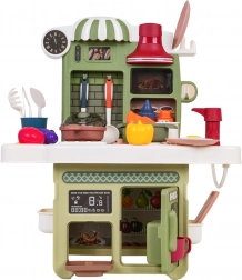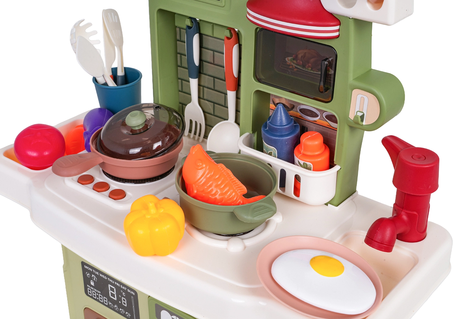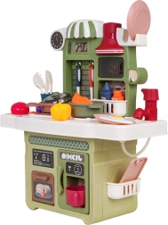 Elle comprend un robinet fonctionnel à eau en circuit (à pompe), pour que les enfants puissent « laver » la vaisselle comme dans une vraie cuisine. S’ajoutent une maquette de machine à café, une hotte éclairée et un four ouvrant. La grande variété d’accessoires – casseroles, poêles, assiettes, ustensiles et aliments – élargit les possibilités de jeu.
