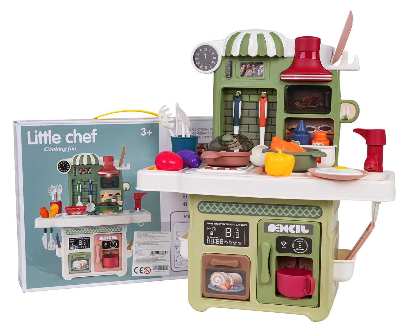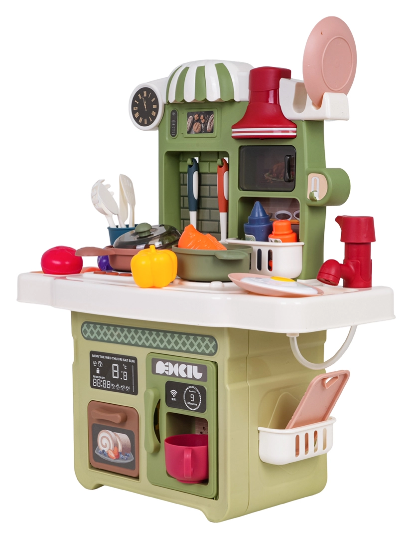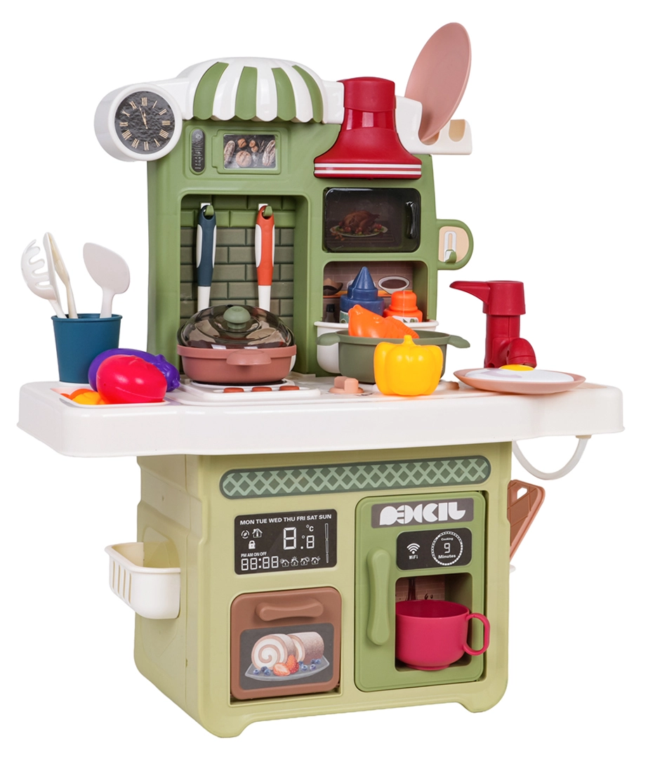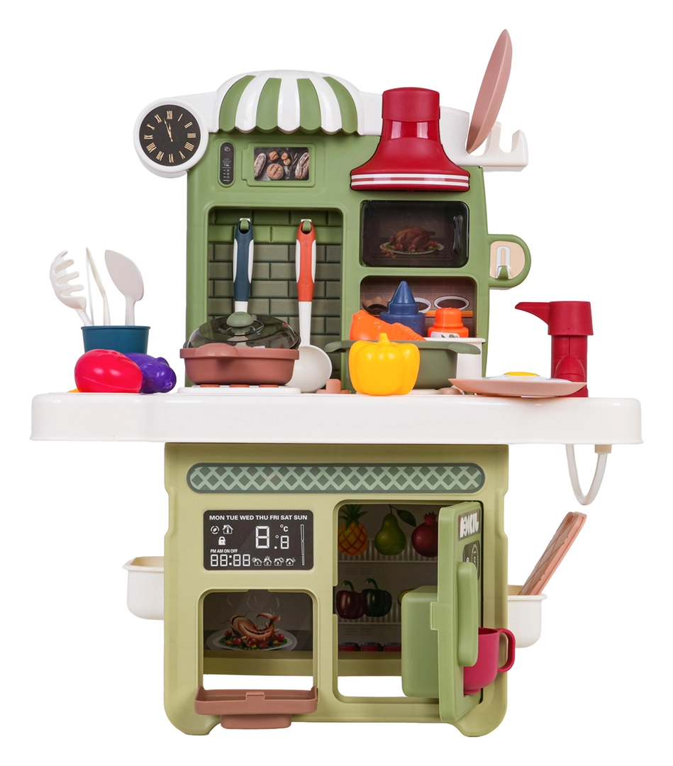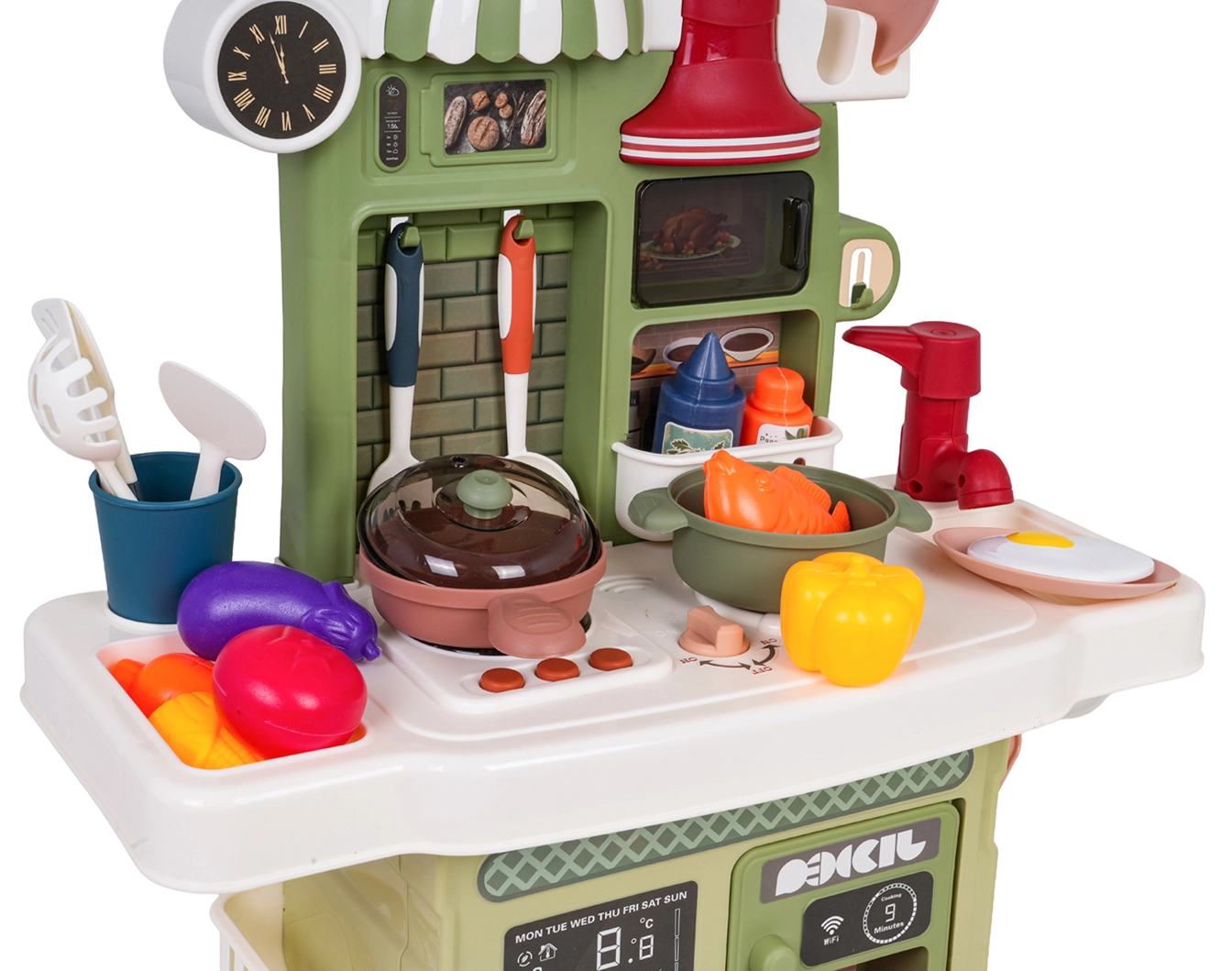 Cette cuisine en plastique de qualité aux couleurs vives stimule l’imagination, la motricité fine et les compétences sociales. Grâce aux brûleurs éclairés et aux sons réalistes de cuisson et de friture, le jeu paraît authentique. En appuyant sur les boutons, des chansons joyeuses, des comptines et des conseils de sécurité se déclenchent pour rendre le jeu encore plus amusant.