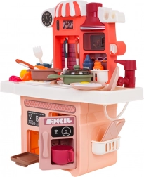 L’attraction principale est le robinet fonctionnel – une pompe à piles fait couler l’eau dans l’évier, permettant aux enfants de “laver la vaisselle” comme dans une vraie cuisine. Sont également inclus un four ouvrant, une imitation de machine à café et une hotte aspirante éclairée. Le riche assortiment d’accessoires (casseroles, poêle, ustensiles, assiettes et aliments) élargit les possibilités de jeu.