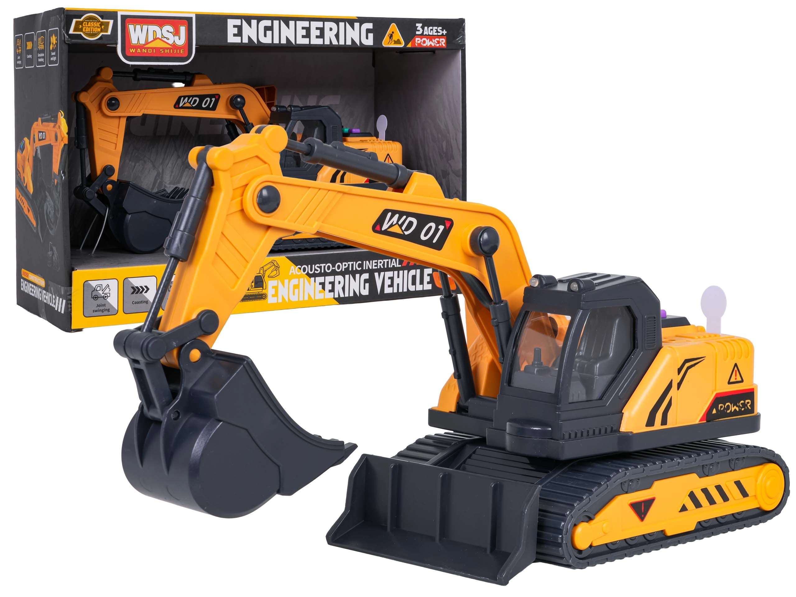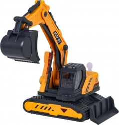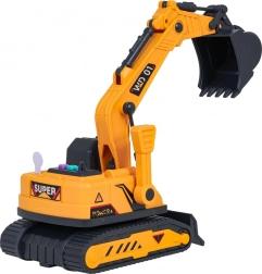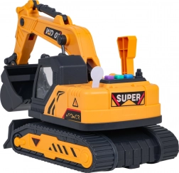 Sur le toit de la cabine se trouve un panneau de commande avec des boutons qui déclenchent des effets lumineux (lumières clignotantes) et des sons de démarrage, de fonctionnement de la machine et de marche arrière. Le jouet est fabriqué avec des matériaux de qualité, avec un souci du détail et de la sécurité, idéal pour les petits fans d’engins de chantier.