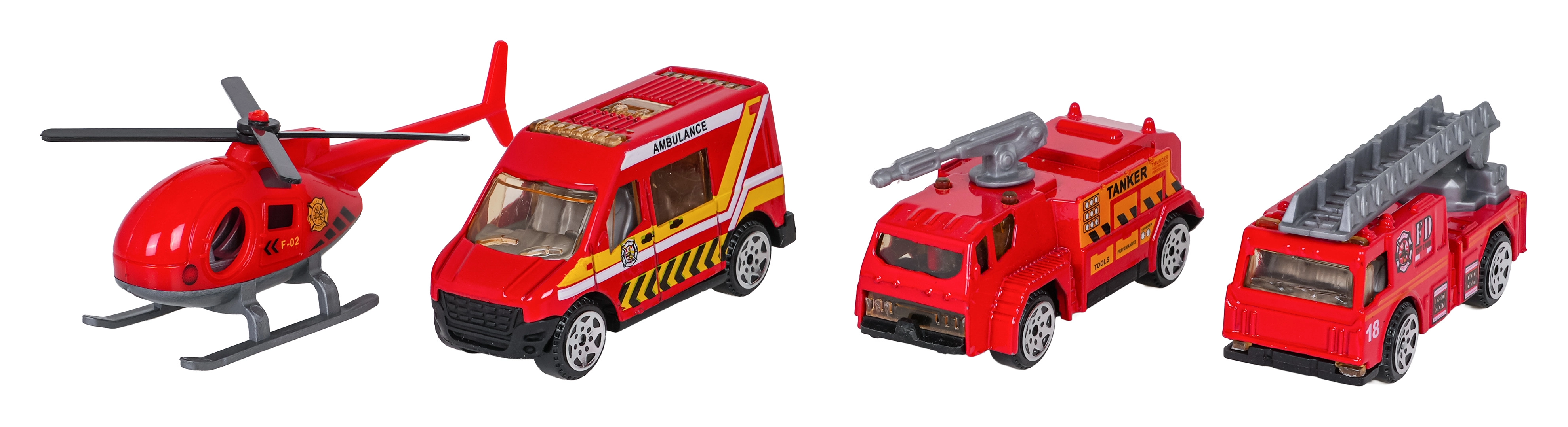 Trois petites voitures en métal robustes avec éléments mobiles et un hélicoptère détaillé enrichissent les possibilités de jeu et le réalisme de l’action.