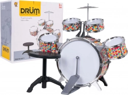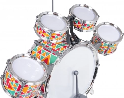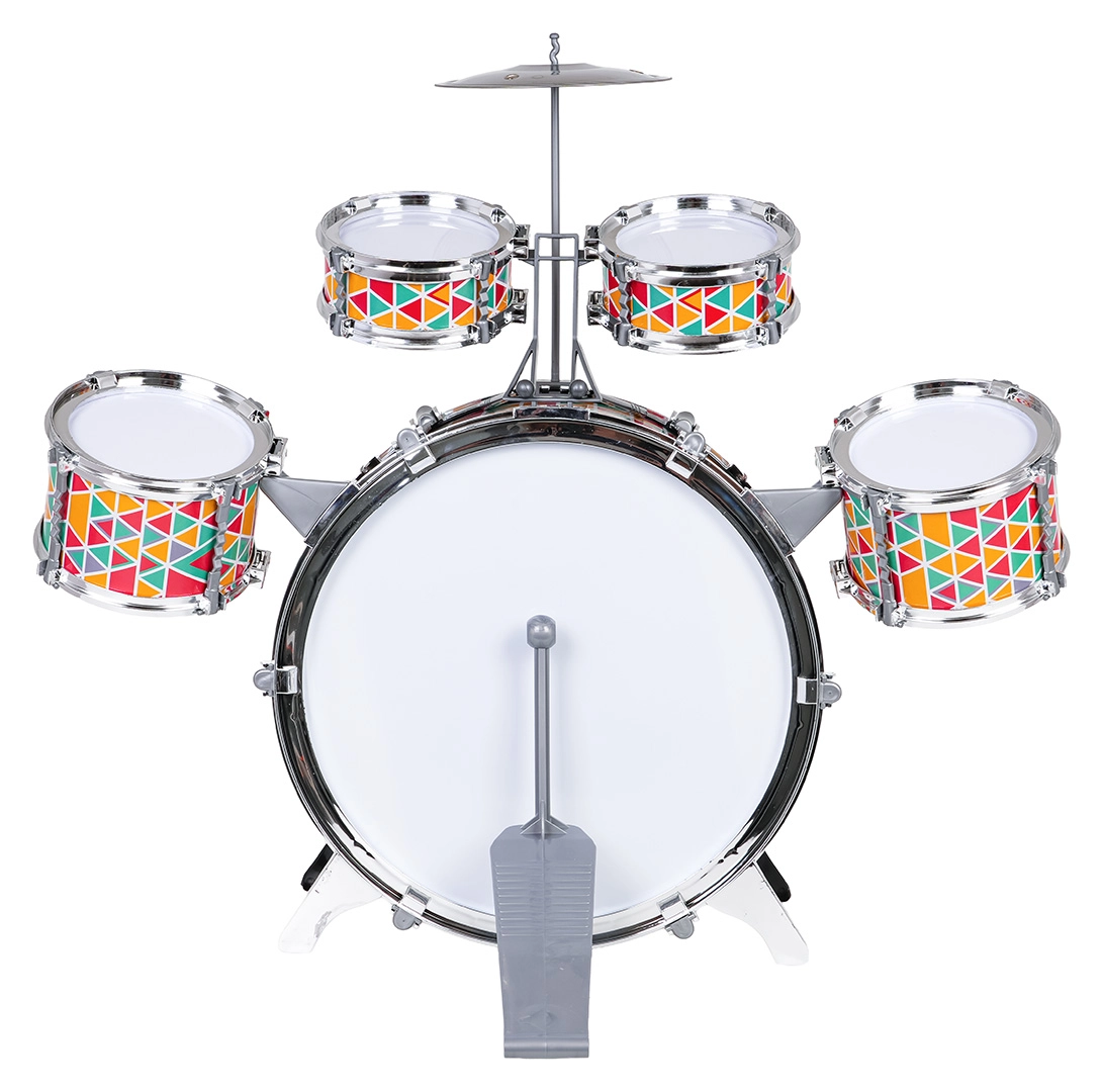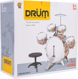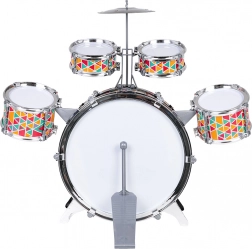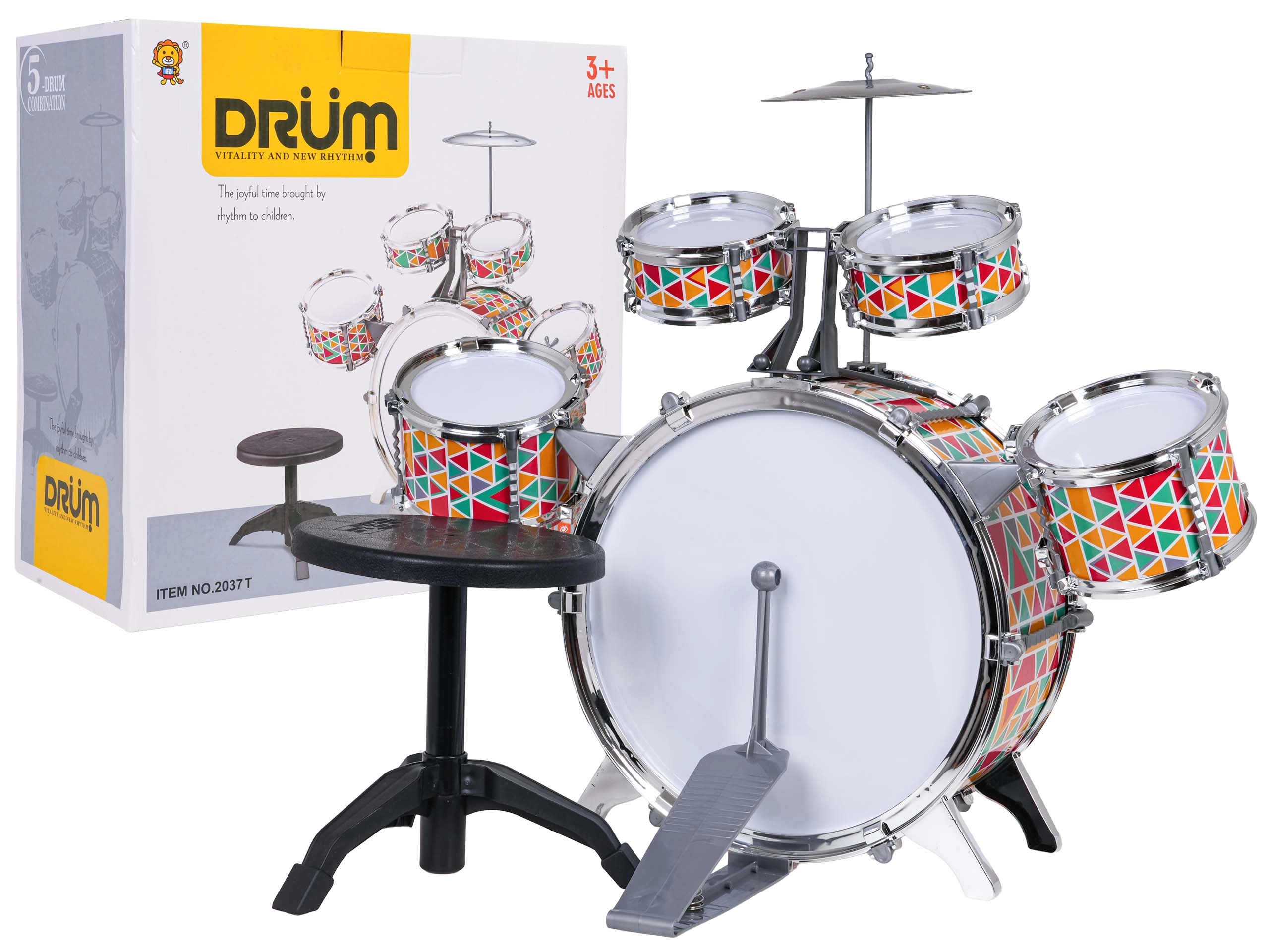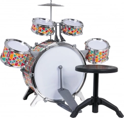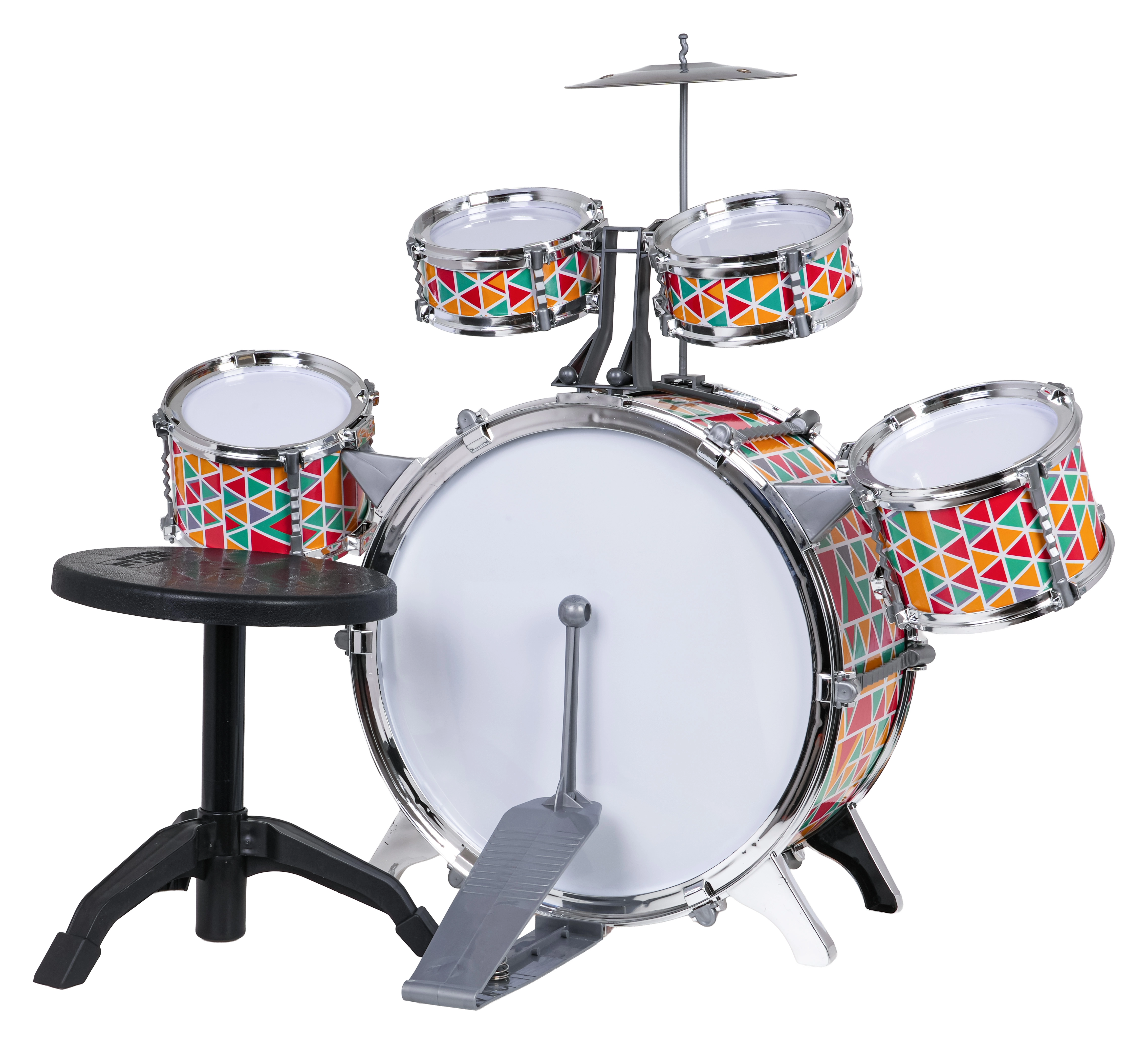 - grosse caisse avec pédale, 2× tambour moyen, 2× petit tambour, cymbale en métal, 2× baguette, tabouret