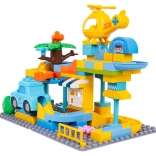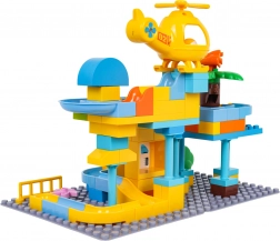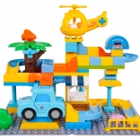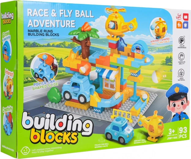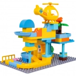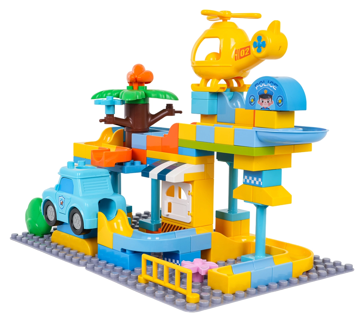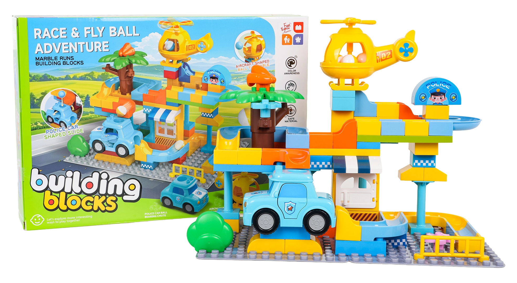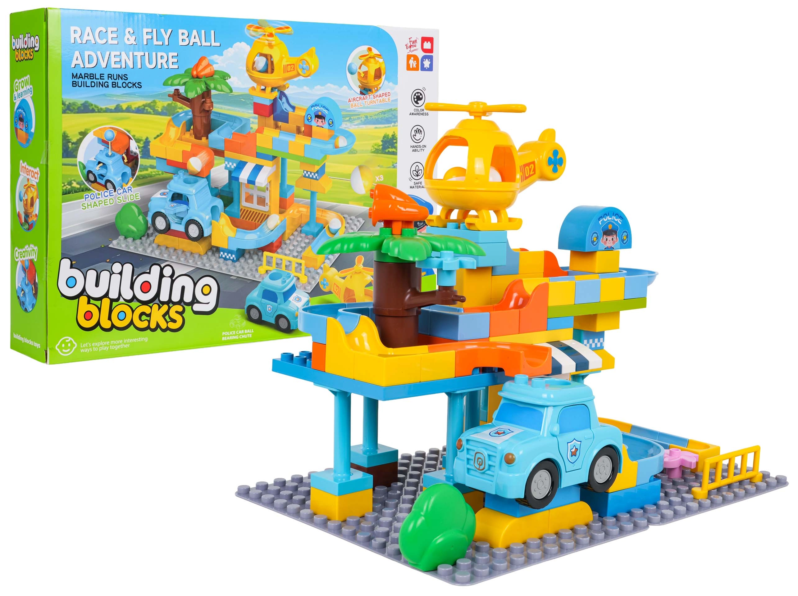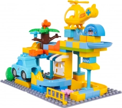 Boîte de construction colorée station de police pour enfants dès 3 ans offre un jeu créatif avec un assemblage simple des briques et une construction stable. Inclut une petite voiture de police, un hélicoptère jaune, un toboggan amusant et 3 balles qui peuvent traverser la voiture et l’hélicoptère. Idéal pour développer l’imagination, la motricité et la créativité.