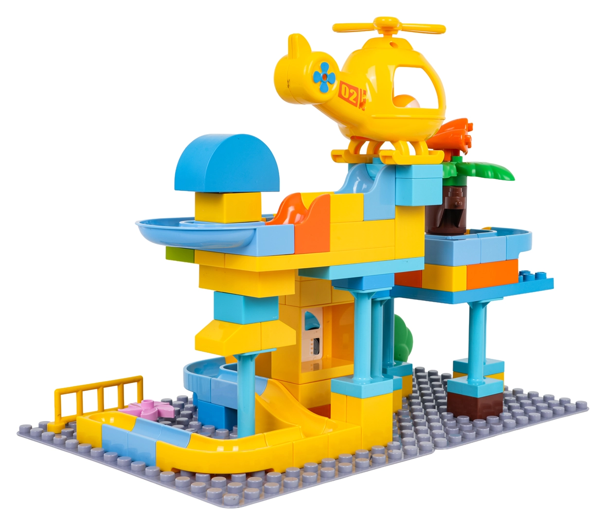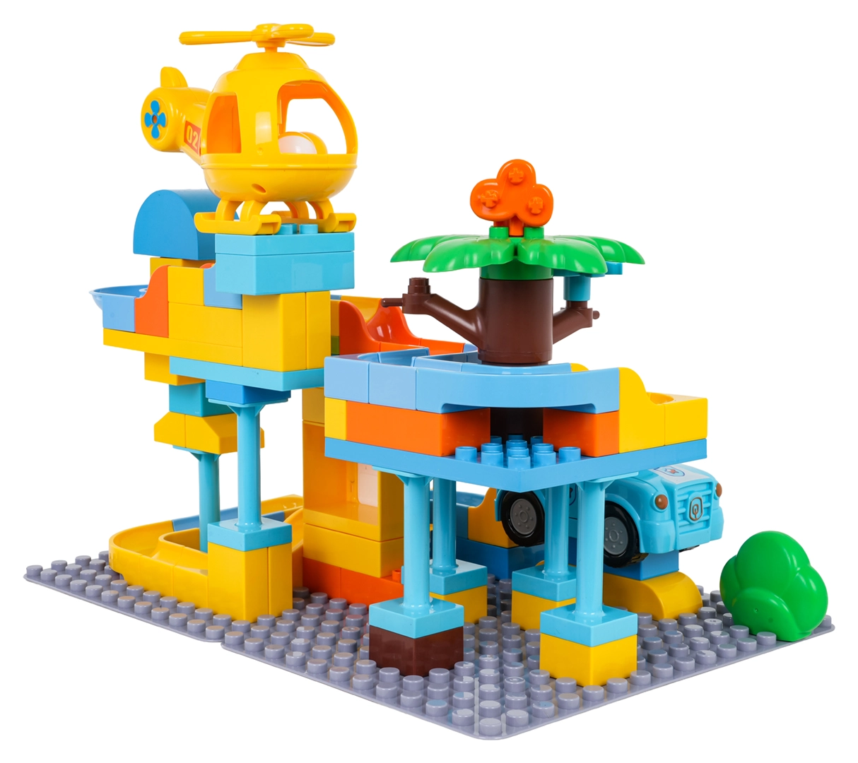 - Jeu créatif : construction, courses de la petite voiture sur les rampes, atterrissage de l’hélicoptère.
