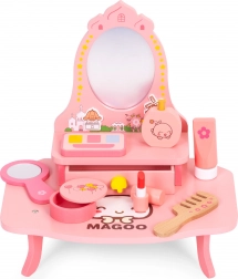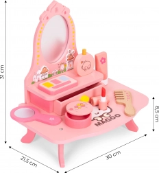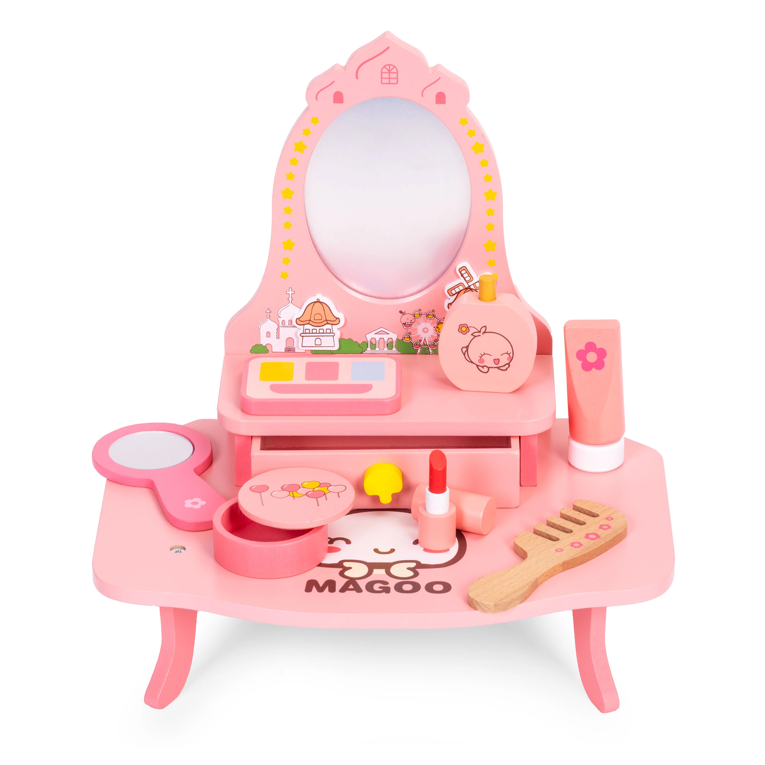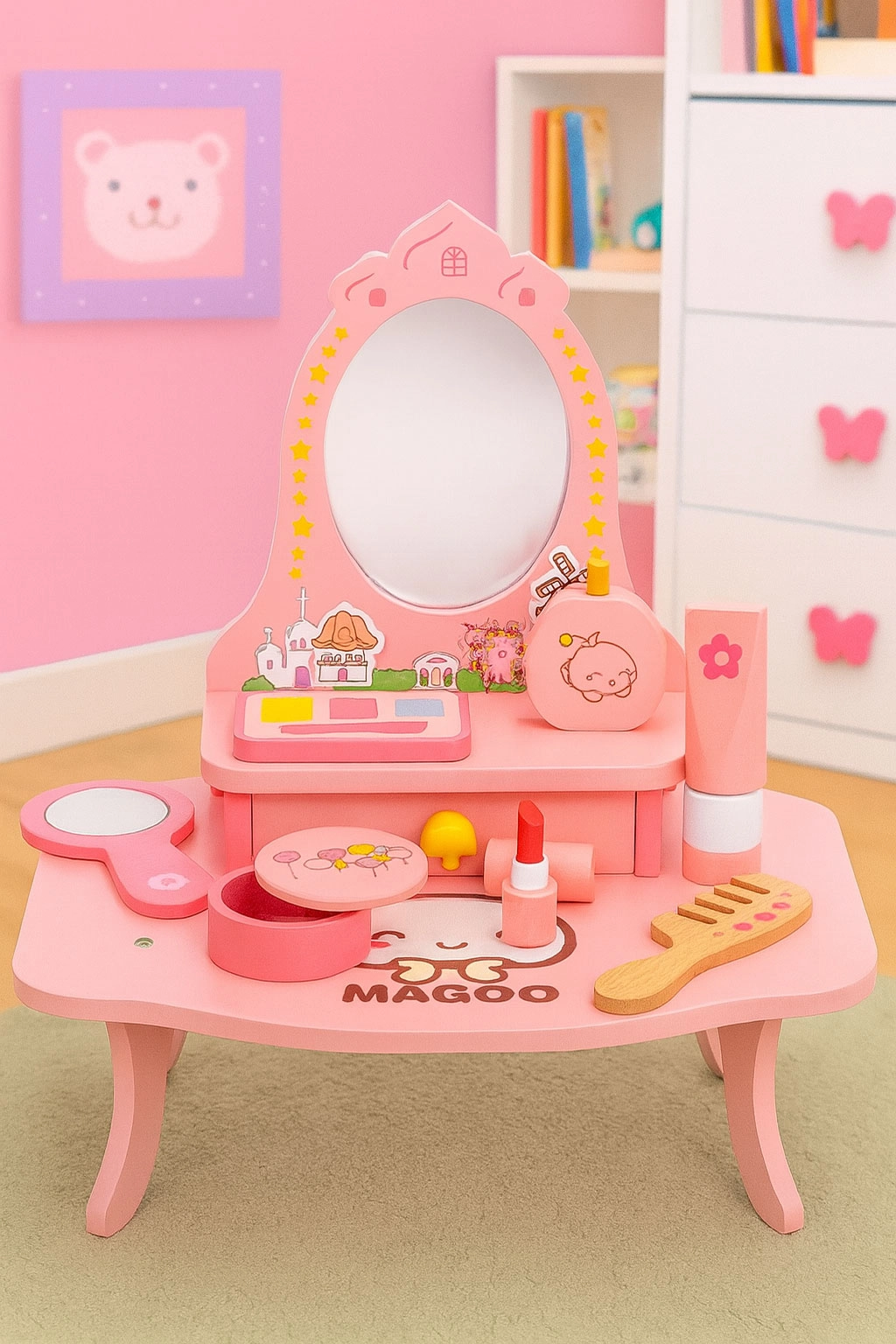Le miroir décoratif aux formes arrondies crée une atmosphère de conte de fées et encourage la mise en beauté et le rôle de « salon de coiffure ». Le tiroir pratique range tous les accessoires — du peigne au rouge à lèvres — pour que tout soit toujours à portée de main et bien organisé.