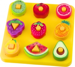 - Base 20 × 20 cm, pièces de fruits colorées avec formes géométriques, chenille à lacer, emballage pratique