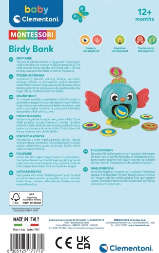 Adorable tirelire en forme de petit oiseau de la marque Clementoni, qui aide les enfants à développer de façon ludique leur éducation financière. Elle possède une fente pratique pour insérer les pièces, un vidage facile des économies et est fabriquée avec des matériaux de qualité et sûrs. Idéale comme cadeau original et comme décoration pour la chambre d'enfant.