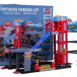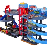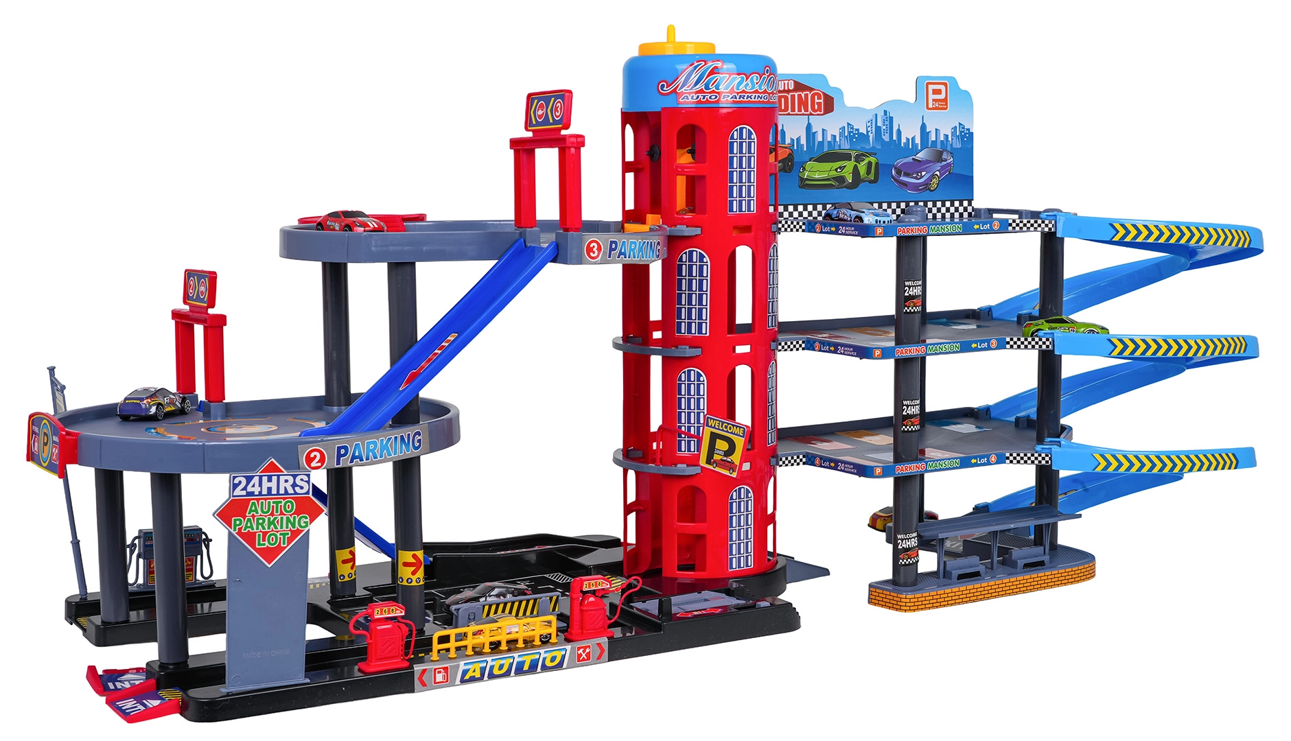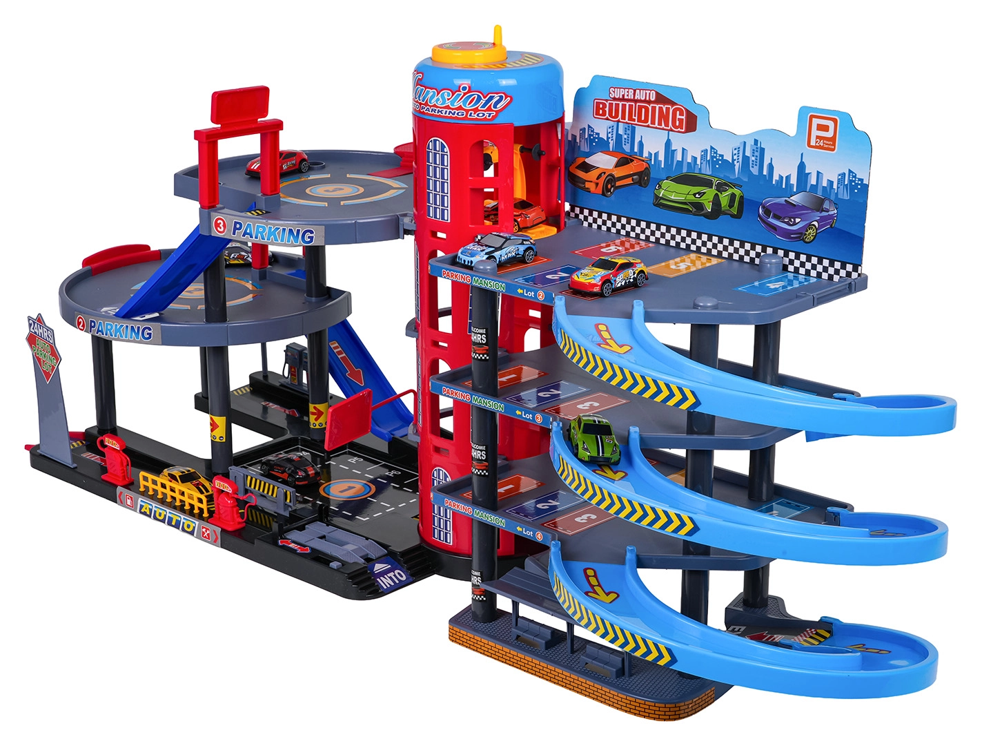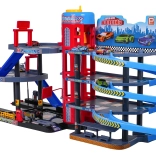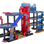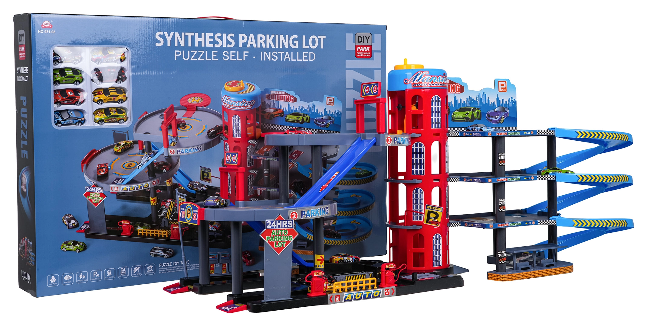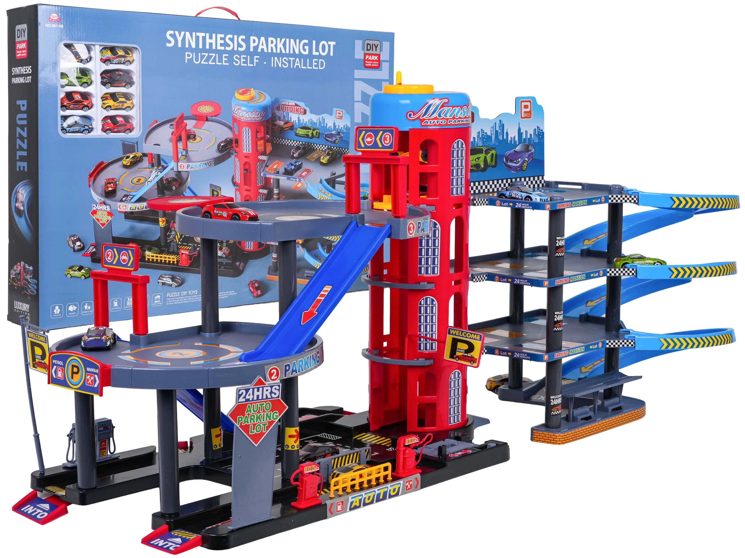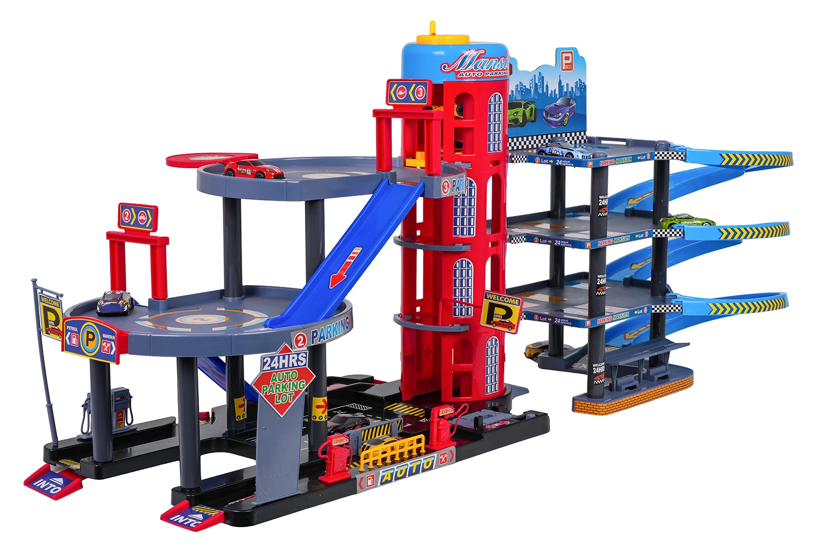 Grand garage de stationnement à plusieurs niveaux avec ascenseur et rampes de course qui ravira les petits conducteurs dès 3 ans. Comprend un stationnement sur 4 niveaux, un ascenseur fonctionnel, des descendes en spirale, une station-service et un héliport. Le coffret contient 8 petites voitures métalliques et des autocollants colorés pour encore plus de plaisir.
