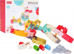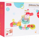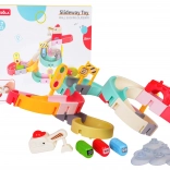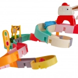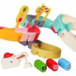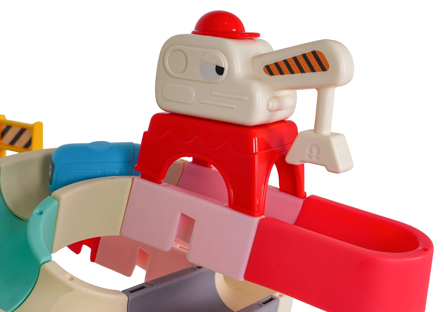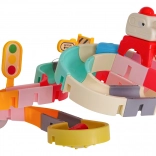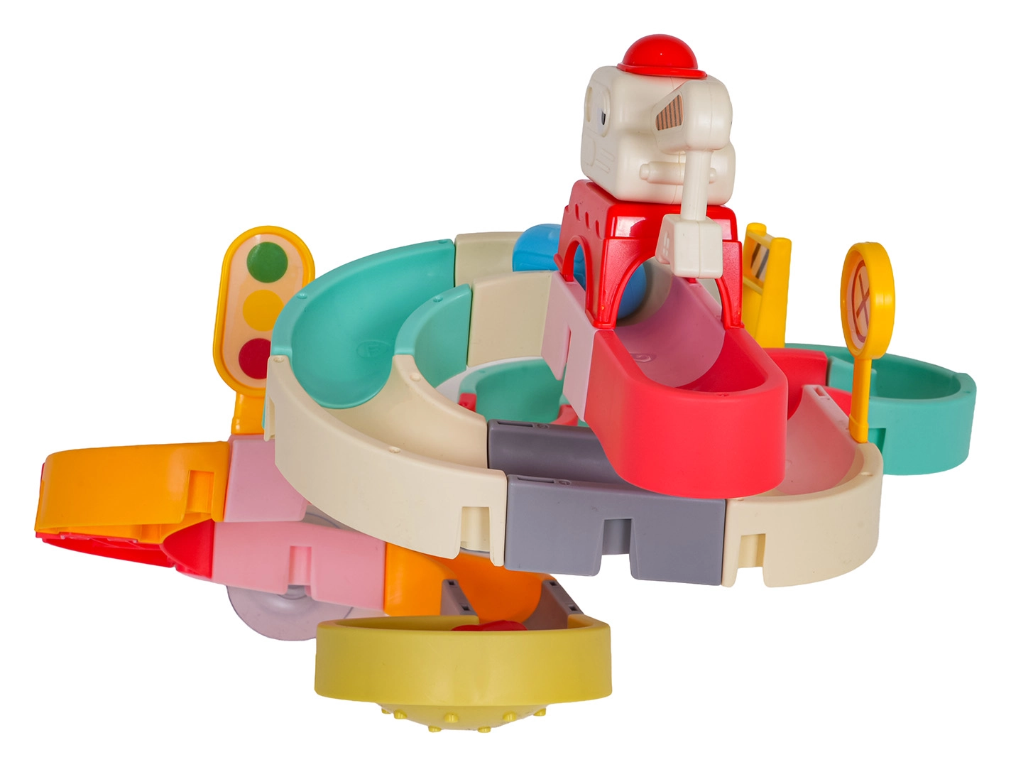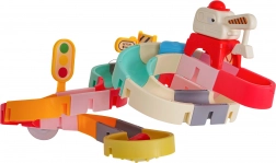 Des pièces colorées et interconnectables ainsi que des éléments routiers stimulent la motricité fine, l’imagination et la compréhension des causes et des effets.