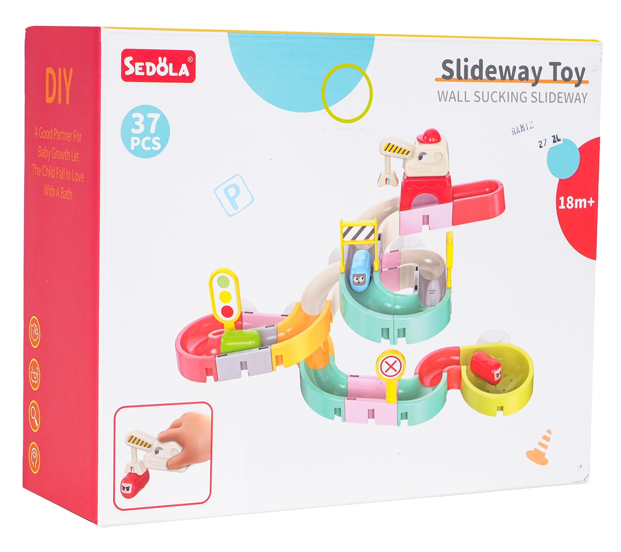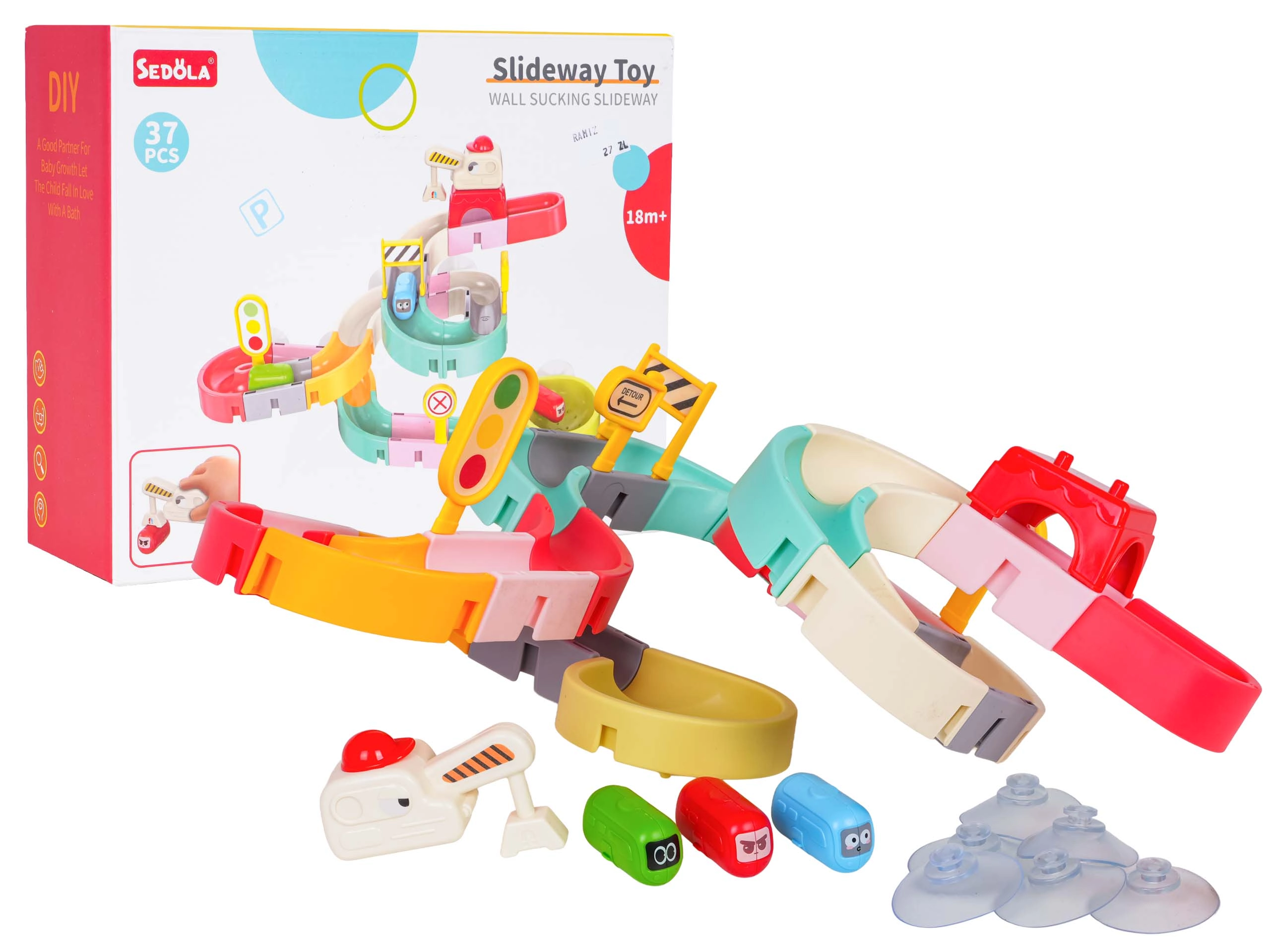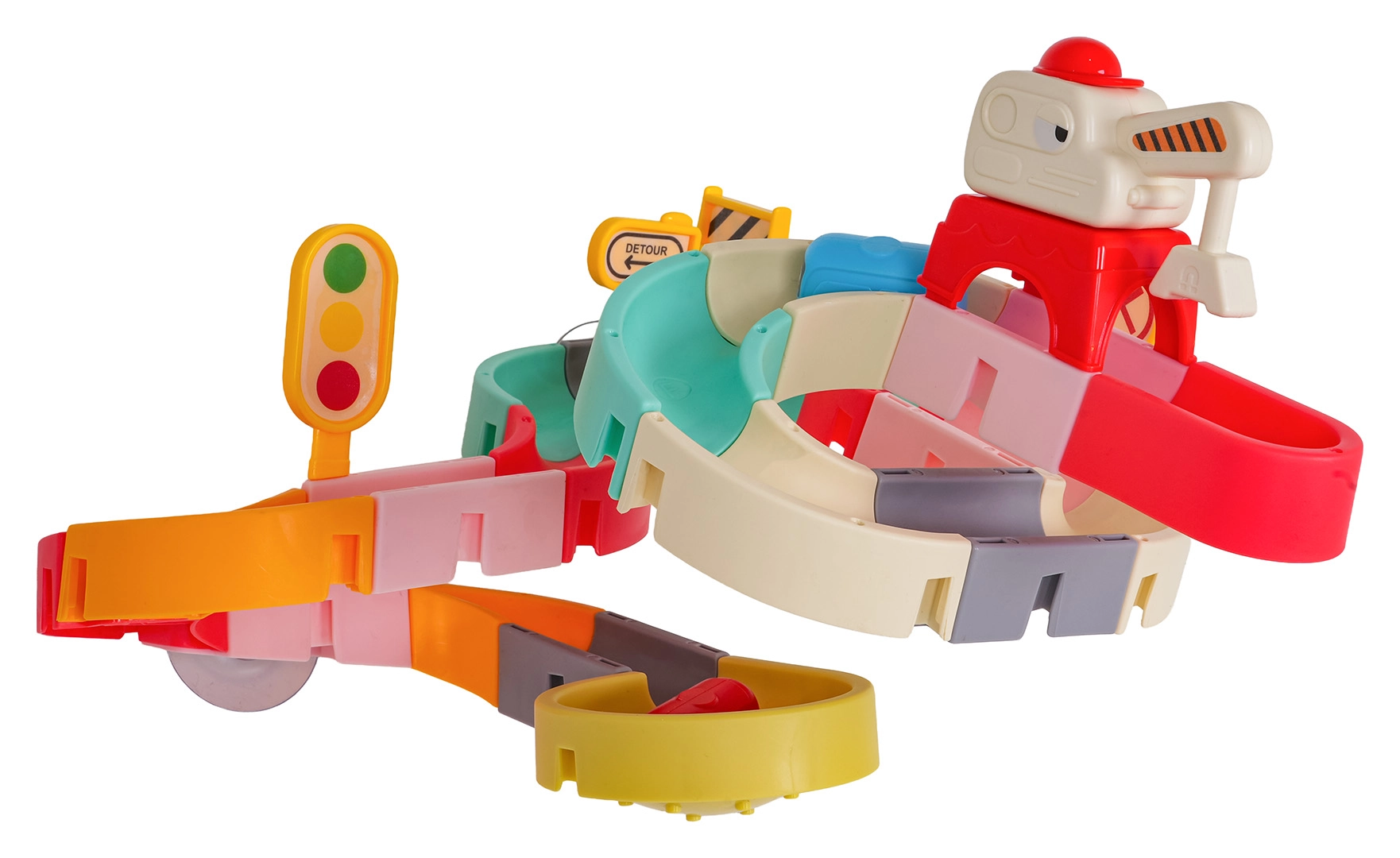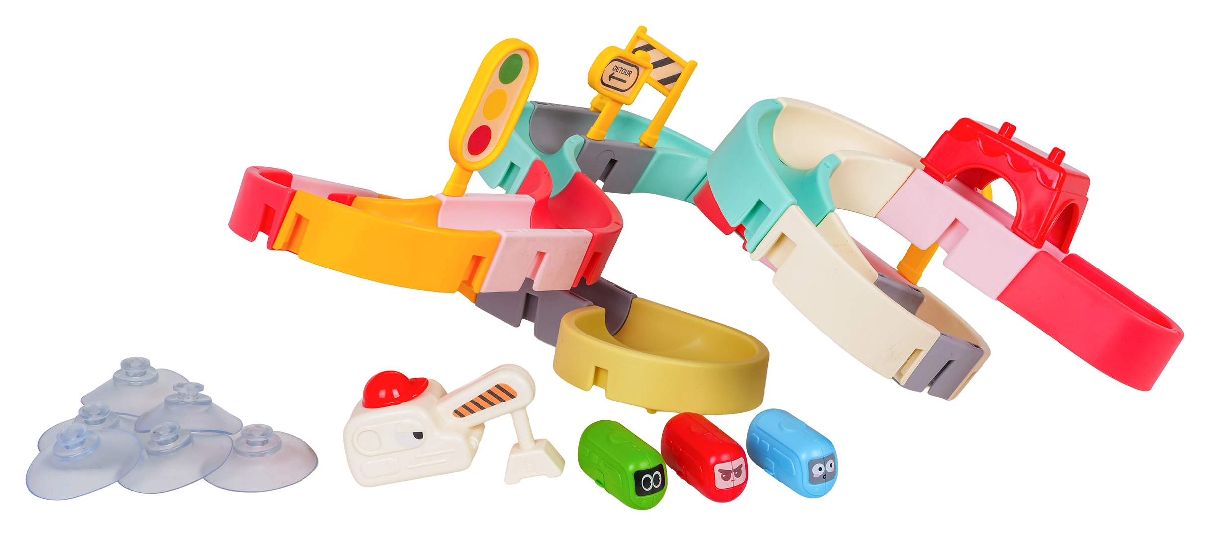 Le jeu est sûr et varié : plastique de qualité sans arêtes vives, ventouses puissantes pour la stabilité et couleurs vives qui motivent les enfants à créer sans cesse de nouvelles pistes. Sont également inclus panneaux de signalisation, barrières et autocollants pour encore plus de créativité.