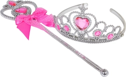 Une couronne argentée ornée de pierres roses et une baguette assortie confèrent un éclat royal au costume et stimulent l’imagination lors des jeux de rôle.