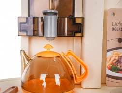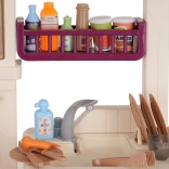 De l’eau coule réellement du robinet, tandis que le réfrigérateur, le four, les placards et les étagères accueillent tous les accessoires et gardent le coin de jeu bien ordonné.