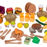 Le coffret contient 93 pièces – casseroles, poêle, bouilloire, vaisselle, couverts, ustensiles de cuisine, pots d’épices, poubelles, ainsi qu’un large choix d’aliments et de boissons. On y trouve aussi une horloge à aiguilles mobiles et des cartes de menu pour encore plus d’imagination. La cuisine est idéale pour développer la motricité fine, les compétences sociales et la créativité.