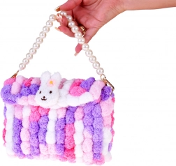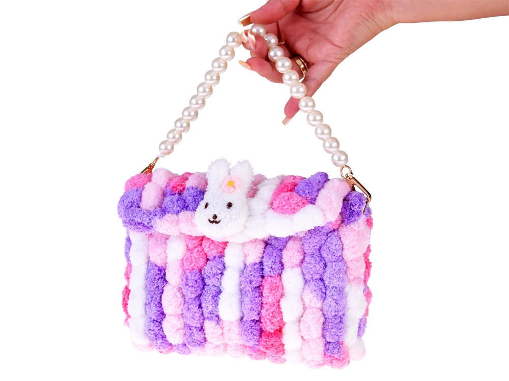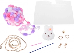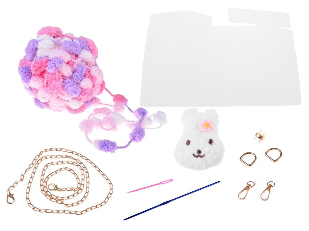 Dans la boîte, vous trouverez le fil « pom‑pom » coloré, une toile plastique perforée comme base, une chaîne en métal, des aiguilles, des anneaux en D, une fermeture, des perles pour une anse perlée et une notice illustrée. Étape par étape, assemblez facilement un mini sac au motif lapin qui ravira petites et grandes créatives.
