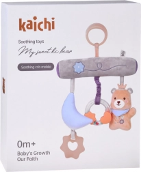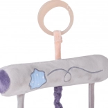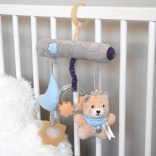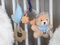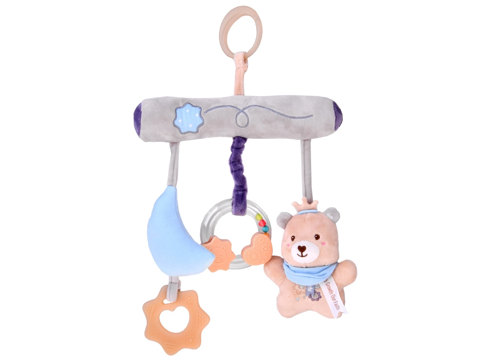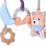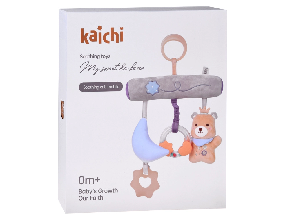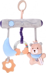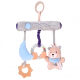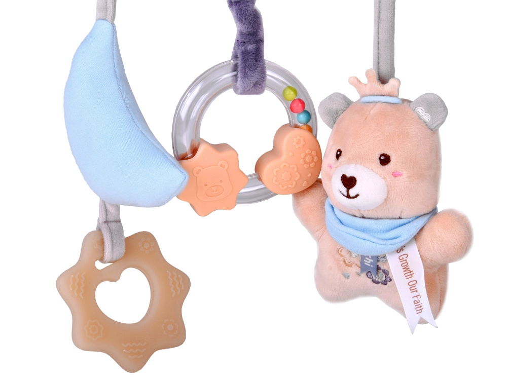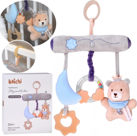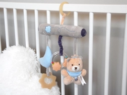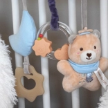 Ce jouet suspendu avec ourson est conçu pour divertir en douceur et stimuler les sens de votre bébé. Les tons pastel apaisent, tandis que les textures et les sons éveillent la curiosité naturelle et soutiennent le développement moteur. Grâce à l’anneau universel, il se fixe facilement au lit, à la poussette ou au siège auto.