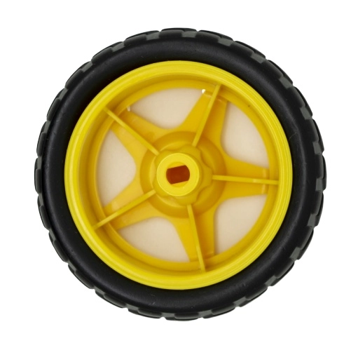 Roue universelle en plastique avec pneu en caoutchouc noir de 65 mm de diamètre pour kits de robots et voitures RC. Idéale pour les robots Arduino, les robots suiveurs de ligne et les robots évitant les obstacles. Offre une bonne traction et un déplacement sûr sur carrelage, sol lisse et terrain légèrement irrégulier.