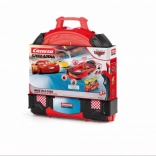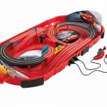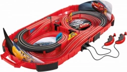 - 1× voiture Flash McQueen, 1× voiture Dinoco Cruz, lignes droites, virages, supports, glissières, valise portable, module d’alimentation, 2× contrôleur, notice