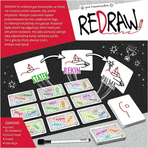 Découvrez le jeu de soirée Redraw de TREFL, qui combine dessin, devinettes et fous rires. Même si vous pensez ne pas savoir dessiner, vous apprécierez une jouabilité rapide et dynamique, des règles simples et 168 mots à deviner. Les joueurs se relaient pour redessiner et améliorer les dessins, tandis que les autres essaient de trouver le bon mot. Le premier à collecter 5 cartes remporte la partie.