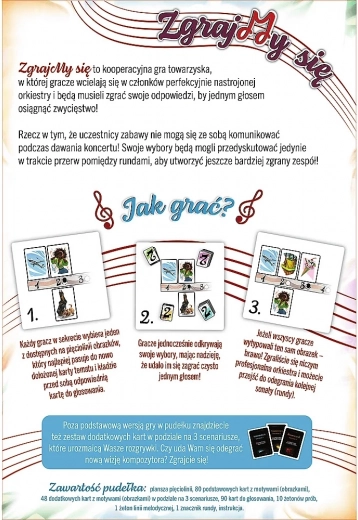 « ZgrajMy się » propose une expérience originale sur le thème musical, où les joueurs ne doivent pas communiquer pendant le « concert » et n’accordent leurs stratégies que pendant les pauses entre les manches. Chaque décision compte, et l’harmonie du groupe apporte la satisfaction d’une symphonie bien interprétée. Grâce à sa durée courte et à ses règles simples, c’est un excellent party game qui convient aussi aux familles avec ados.