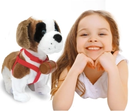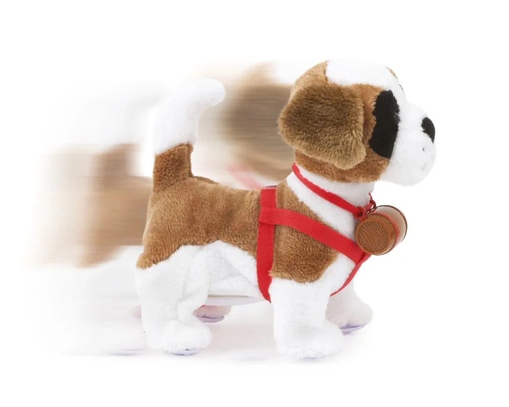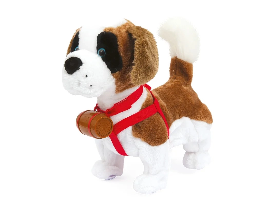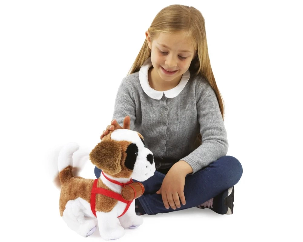 Son pelage doux, le harnais rouge et le collier avec le tonnelet emblématique donnent au jeu une touche de réalisme de chien sauveteur et beaucoup d’imagination.