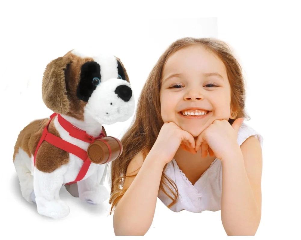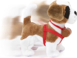 Samby est un saint-bernard en peluche très doux qui imite fidèlement le comportement d’un vrai chien. Une caresse sur la tête et il aboie joyeusement et remue la queue; avec le harnais et une caresse sur les flancs, il réagit avec enthousiasme. Un simple claquement de mains l’invite à marcher – le tout sans commande compliquée.