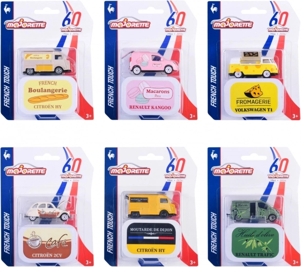La série comprend six véhicules stylés inspirés par des spécialités françaises : CITROËN HY (French Boulangerie – marron, Moutarde de Dijon – jaune), RENAULT Kangoo (Macaron – rose), RENAULT Trafic (Huile d’olive – vert), VOLKSWAGEN T1 (Fromagerie – jaune) et CITROËN 2CV (Café – beige). Chaque modèle est à l’échelle 1:64, d’une longueur d’environ 7,5 cm, et est présenté dans une élégante boîte métallique de collection.
