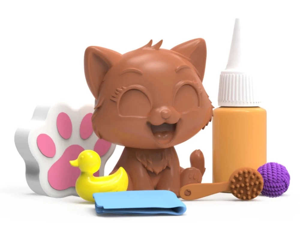 - 1 figurine de chaton Violette, 1 petit tube de « boue », 5 accessoires (éponge, petite brosse, canard, pelote, petite serviette)