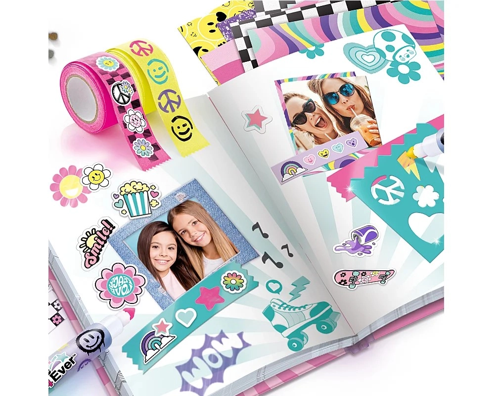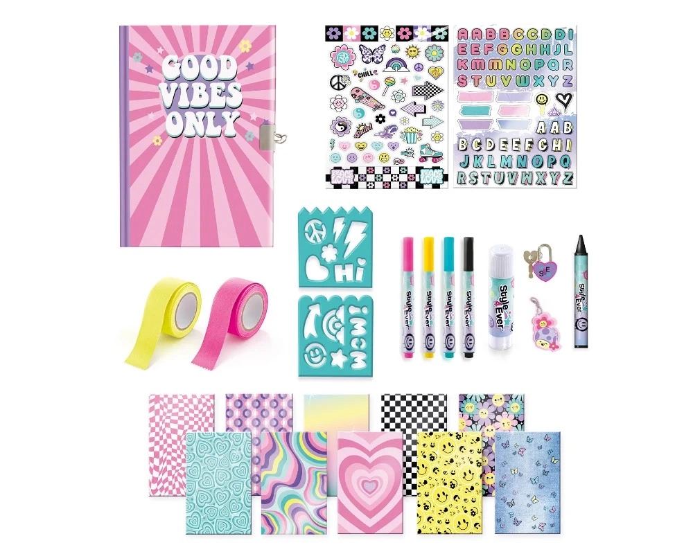 - 1× journal secret, feutres, rubans, pochoirs, feuilles à motifs, planches d’autocollants