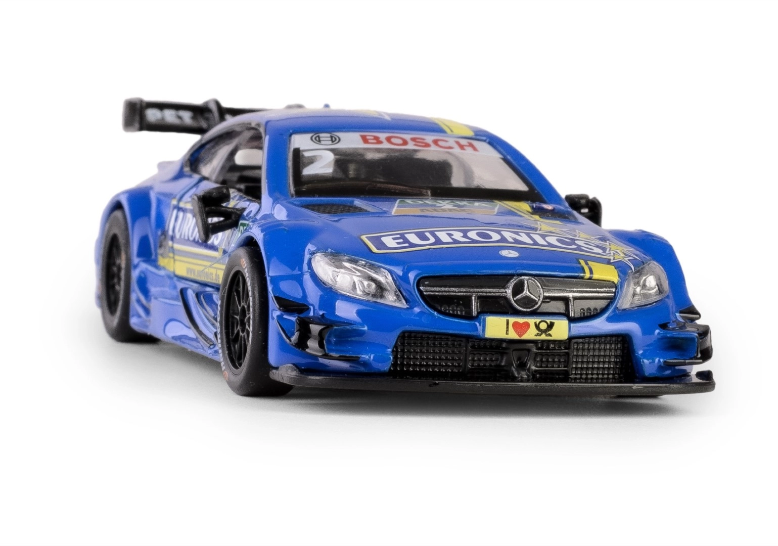 Modèle de course bleu authentique MERCEDES‑AMG C 63 DTM à l’échelle 1:43, combinant métal et plastique pour une grande résistance et des détails réalistes. Il propose des portes latérales ouvrantes, des pneus en caoutchouc et un mécanisme à rétrofriction (pull‑back) amusant. Idéal pour les enfants dès 3 ans et les collectionneurs, conforme aux normes de sécurité européennes CE.